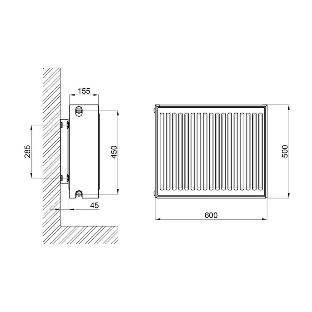 Радіатор сталевий Aquatronic 33 тип 500х600 бічне підключення — рішення для автономних систем опалення. Розмір такого опалювального приладу становить ширину 60, а в глибину - 15,5 сантиметра (без урахування елементів кріплення). Всередині батареї — три панелі, в яких циркулює теплоносій, а також ребра з гофрованої сталі. Радіатор укомплектований усіма важливими деталями для настінного монтажу, а також краном Маєвського.