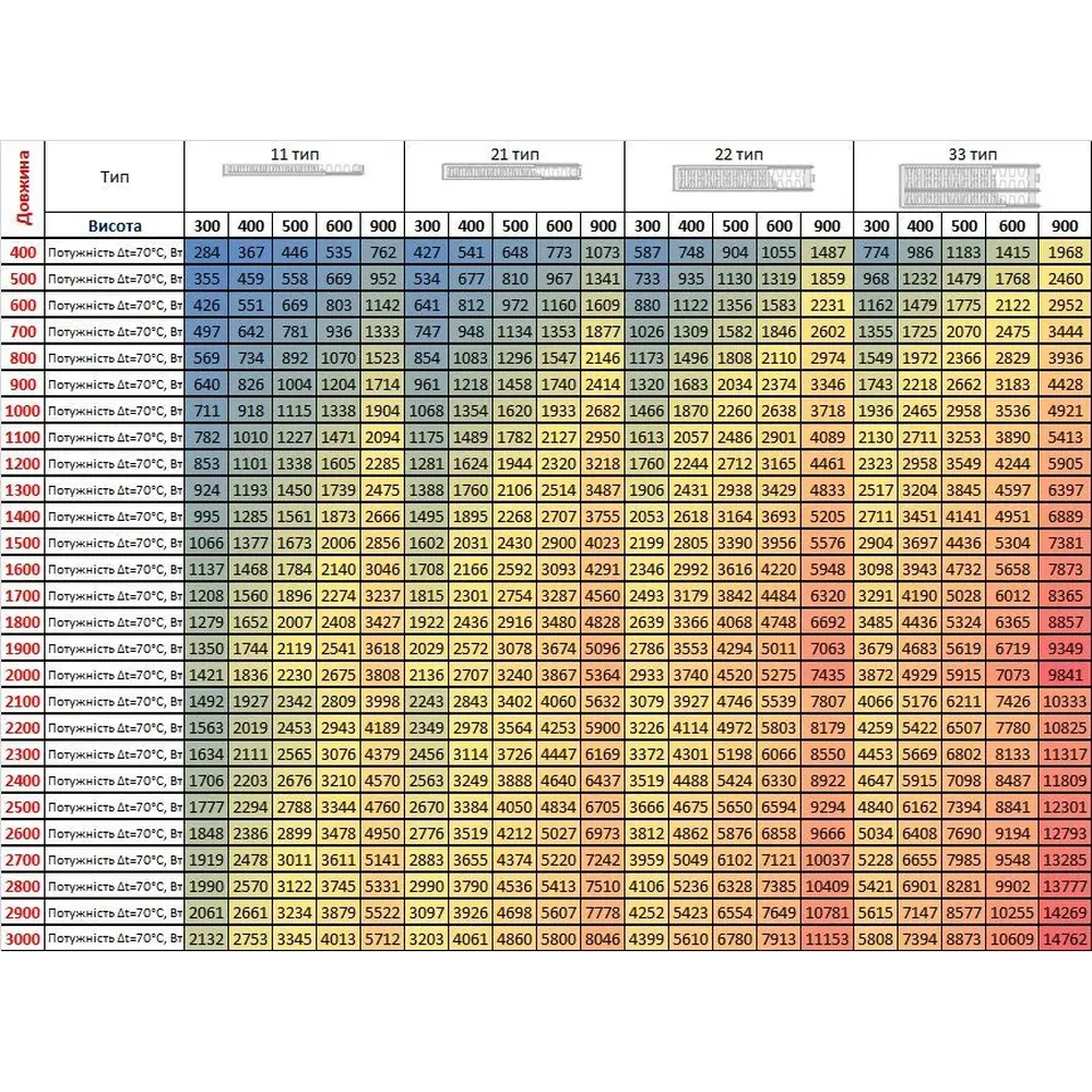 Тепловая мощность Δt = 70/60 / 50 ° C, Вт - 2805/2244/1795