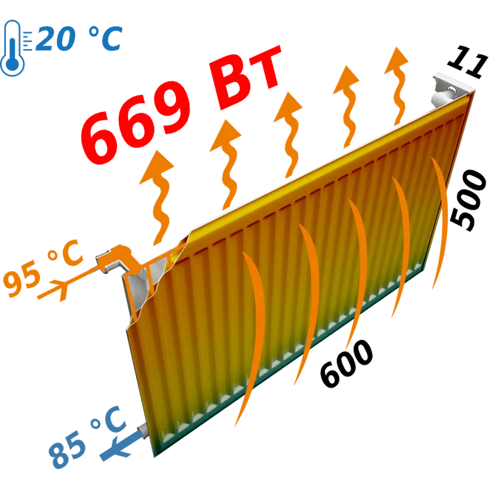 • Теплова Потужність ∆t=70/60/50°C, Вт - 669/535/428