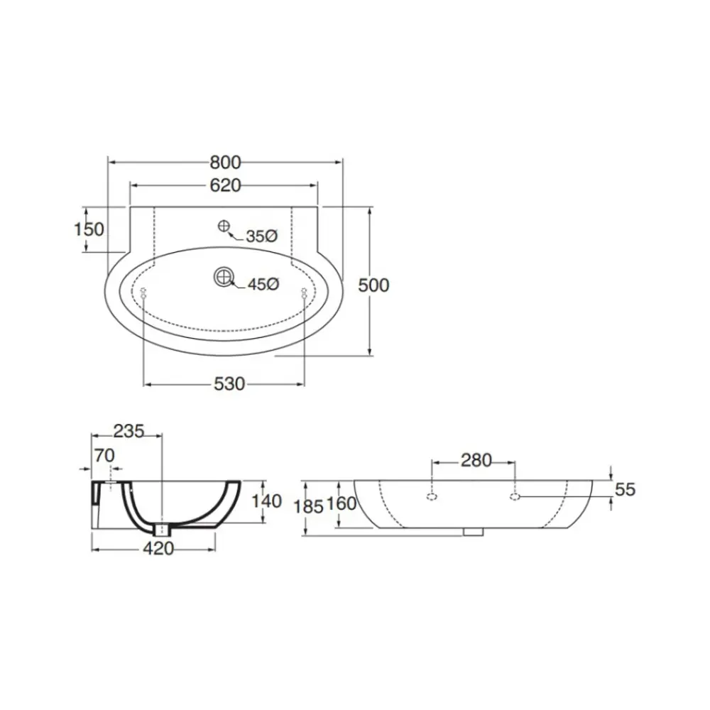 Раковина для ванной комнаты Azzurra Comoda COM80MB1 прекрасно выглядеть, как с пьедесталом, так и без него, подвешенный к стене с помощью кронштейнов. Чаша изготовлена в форме продолговатого овала с отверстием для перелива и отверстием для слива воды с диаметром d = 45 мм. Диаметр отверстия для смесителя d = 35 мм. Благодаря своим формам она легко моется, а на пристенной поверхности можно разместить принадлежности для ванны и аксессуары.