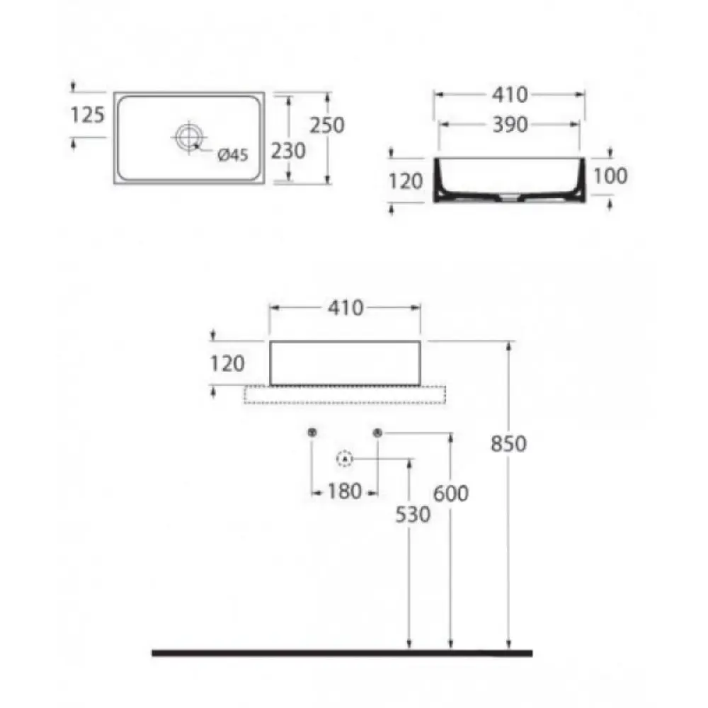 Прямокутна раковина-чаша Azzurra Lavabi arredo GEO41B1 дуже витончено виглядає у ванній кімнаті в стилі арт-дизайн, класика або модерн. Вона має габарити 120х410х250 мм, тому не забере багато місця. Встановлюється на стільницю або на тумбу. Отвір для змішувача не передбачено, але його можна встановити на стіну або стільницю, віддавши перевагу високому виливу. Білосніжна раковина виконана з кераміки з глянцевою поверхнею. Її зручно мити завдяки відсутності кутів.