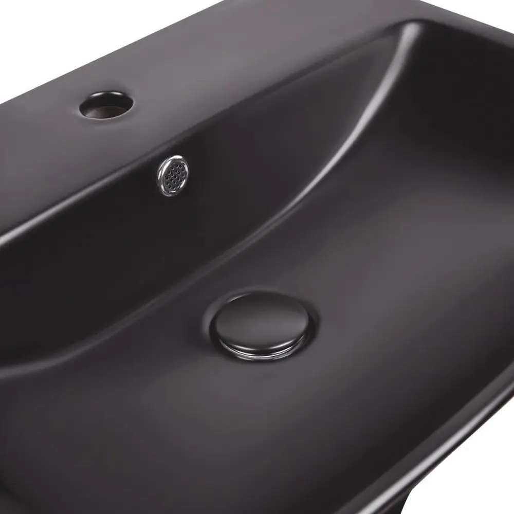 Підвісна раковина Qtap Crow 600х430х385 Matt black QT0511G835MB - це моноблок, де чаша і п‘єдестал є одним цілим. За такої конструкції немає потреби докуповувати п‘єдестал окремо. Виріб виконано з якісної кераміки чорного кольору, вкритої емаллю для захисту від вологи і забруднень. Стильний сучасний дизайн раковини доповнить будь-який інтер‘єр санвузла. Раковина комплектується донним клапаном, що дозволить без зусиль наповнювати чашу водою.