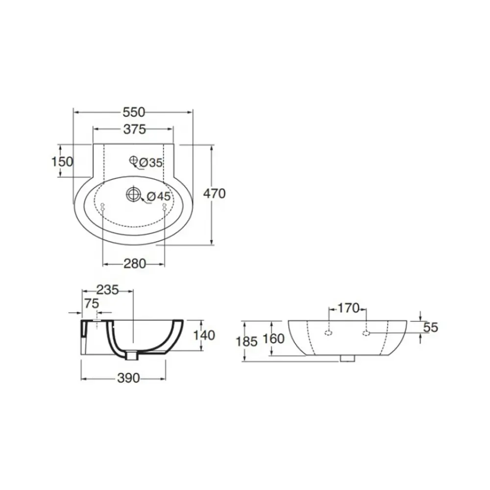 Раковина для ванної кімнати Azzurra Comoda COM55B1/S чудово виглядатиме, як з п‘єдесталом, так і без нього, підвішений до стіни за допомогою кронштейнів. Чаша виготовлена у формі довгастого овалу з отвором для переливу та отвором для зливу води з діаметром d=45 мм. Діаметр отвору для змішувача d=35 мм. Завдяки своїм формам вона легко миється, а на пристінній поверхні можна розмістити приладдя для ванни та аксесуари.
