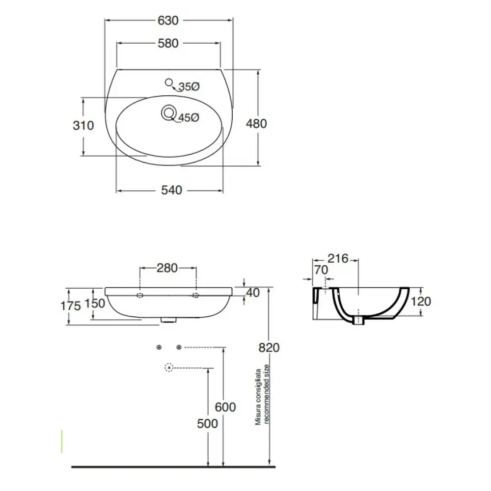 Напівкругла раковина Azzurra Cult XCU200B1/64 виконана з кераміки в білому кольорі з отворами для змішувача та переливу. Вона встановлюється на стіну за допомогою кронштейнів або на п‘єдестал, щоб приховати всі підводи. Діаметр зливного отвору d=45 мм. На пристінній поверхні є можливість поставити ванні аксесуари і приладдя.