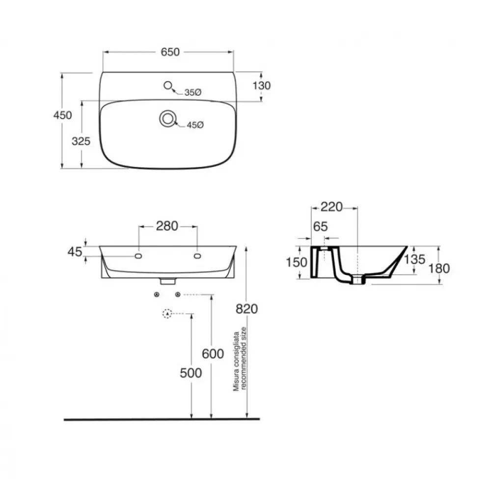 Керамічна раковина Azzurra Prua PRU265MCO1 кріпиться до стіни за допомогою кронштейнів. Вона виконана з кераміки з отвором для змішувача d=35 мм та отвором для зливу води d=45 мм. На пристінний поверхні можна розмістити ванні аксесуари або засоби гігієни. Завдяки відсутності кутів раковину зручно і швидко мити.