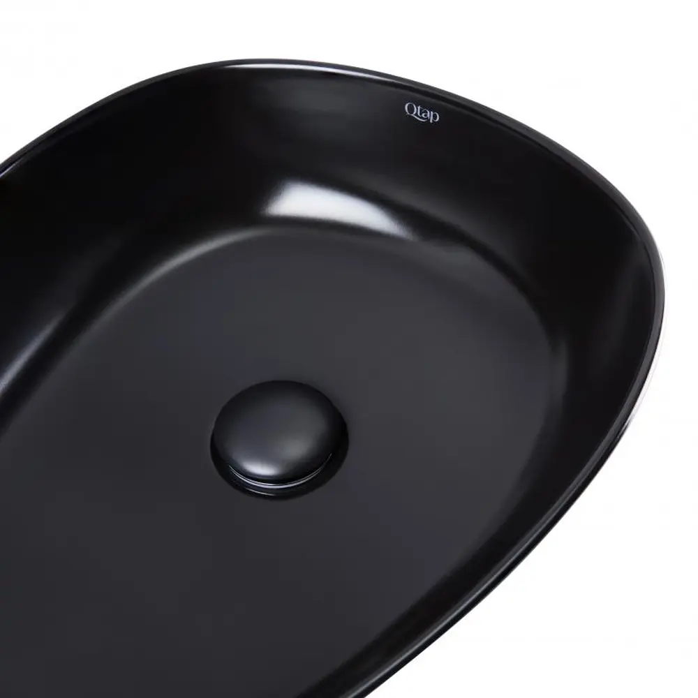 Раковина-чаша Qtap Leo 400x350x160 Matt black з донним клапаном QT1111A053MB стає все більш популярним і затребуваним варіантом у сучасних ванних. Вона встановлюється на стільницю або тумбу, отже не займає місце всередині них, а усі підведення приховані. Виріб виконаний з якісної кераміки чорного кольору. Раковина не обладнана отвором під змішувач, але він буде привабливо виглядати на стіні або поруч на стільниці. У комплект входить керамічний донний клапан.