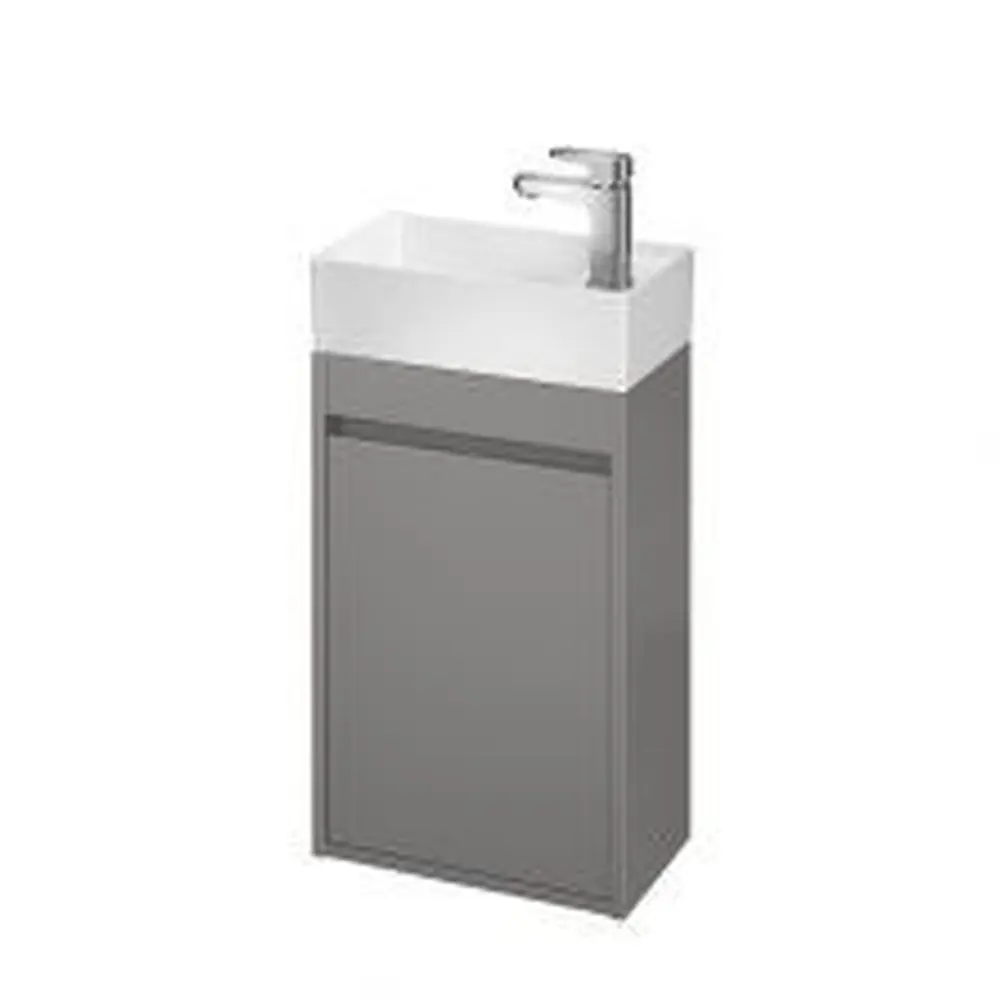 Кабинет CREA - пример вечной, минималистичной формы, полученной благодаря фронтам без ручек. Изготовлен из влагостойкой ДСП и серым фасадом. Модель предназначена для подвесного монтажа под умывальник CREA 40.