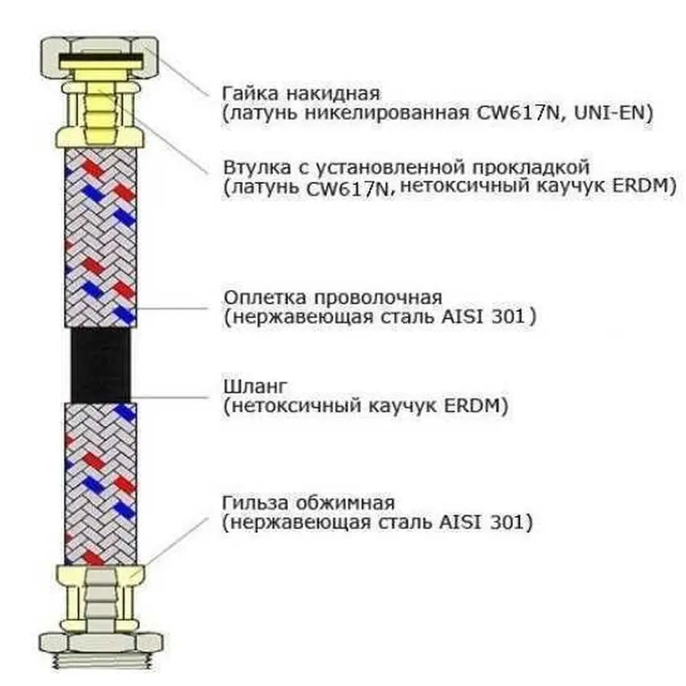 1. Гумовий шланг EPDM - зроблений з нетоксичного гуми, відрізняється надійністю і широким діапазоном допустимих температур. Червоні і сині нитки, вплетені в оплетку, свідчать про можливість використання гнучкого шланга для гарячої та холодної води.