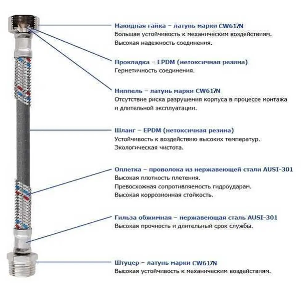 1. Резиновый шланг EPDM - сделан из нетоксичного резины, отличается надежностью и широким диапазоном допустимых температур. Красные и синие нити, вплетенные в оплетку, свидетельствуют о возможности использования гибкого шланга для горячей и холодной воды.