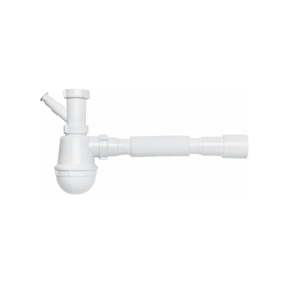 Сифон с увеличенным корпусом, без выпуска и с отводом для подключения стиральной машины. Комплектуется гофротрубою. Если отвод для стиральной машины не используется, то для его надежного закрытия используют полипропиленовую пробку идущую в комплекте.