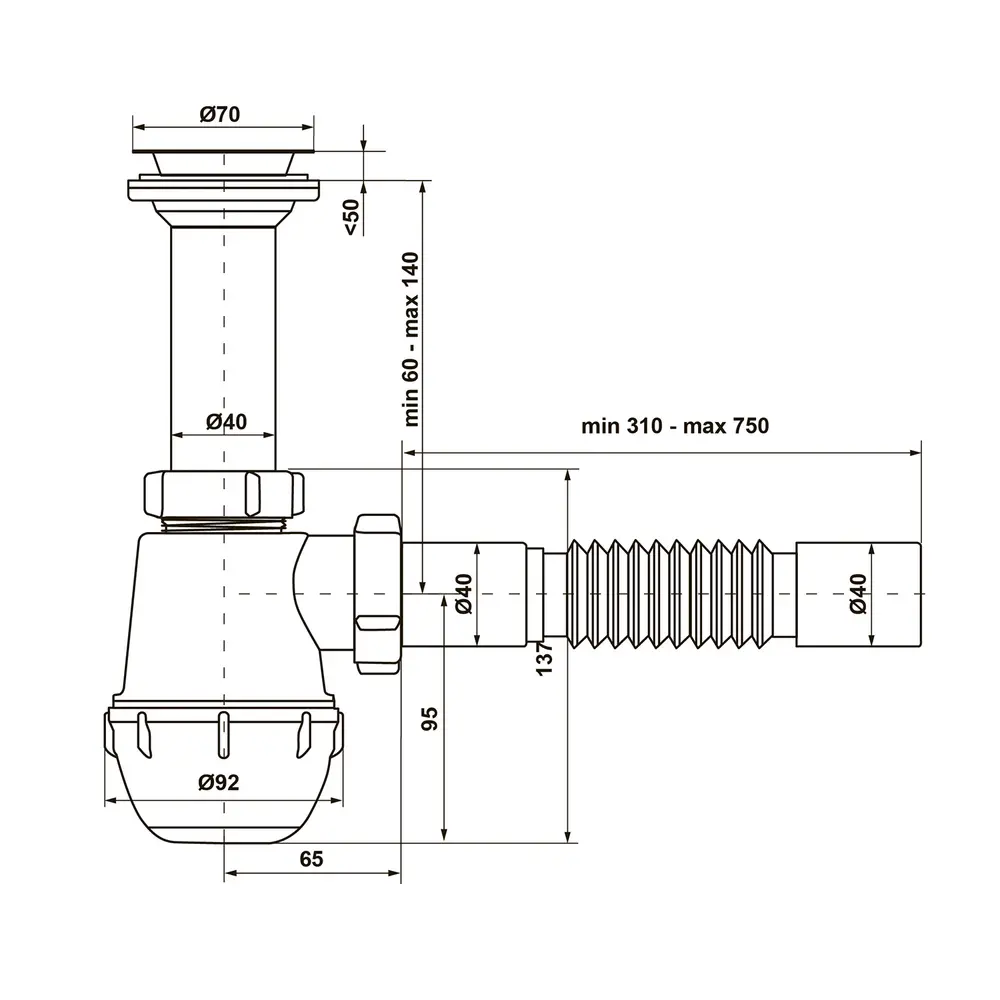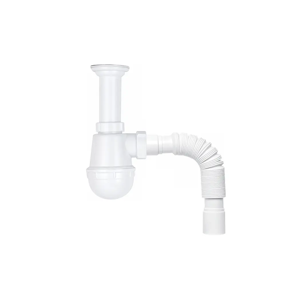 Сифон с резьбовым выпуском. Для подключения к канализации комплектуется гофротрубой. Сетка выпуска, винт и гайка из нержавеющей стали.