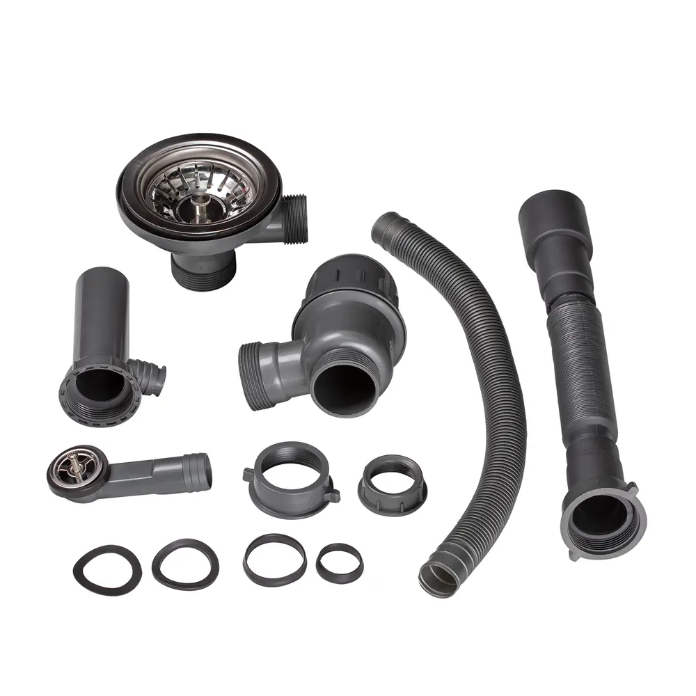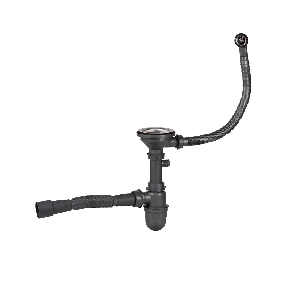 Сифон для кухонной мойки Lidz (GRA) 47 01 003 01 изготовлен из пластика серого цвета в виде стакана-колбы с металлическими решетками и гофрированных труб. Резервуар сифона откручивается для очистки. Гофрированный выход дает возможность изменять длину и угол трубы. Благодаря коммуникации для перелива можно избежать переполнения кухонной раковины водой.
