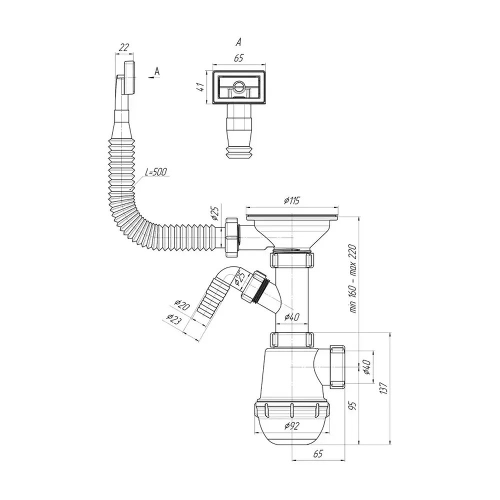 Сифон, різьбовий випуск, гнучкий прямокутний перелив, нержавіюча сітка