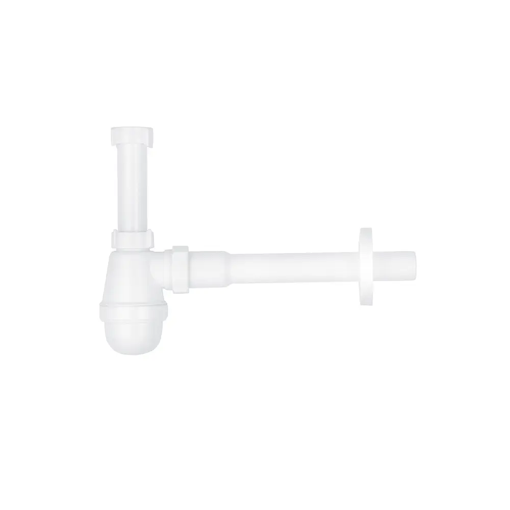 Сифон без выпуска. Для подключения к канализации комплектуется гибкой трубой и резьбовой накидной гайкой.