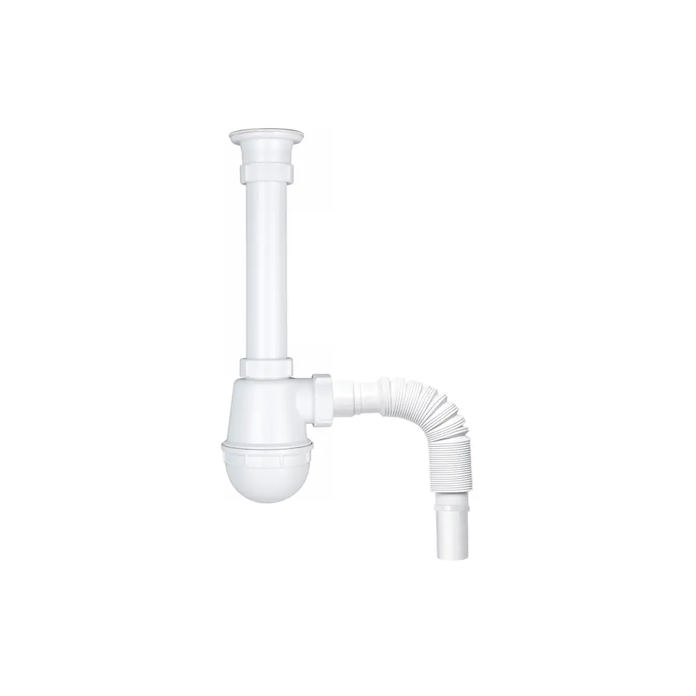 Сифон с резьбовым выпуском и гофротрубой. Сетка выпуска, винт и гайка сделаны из нержавеющей стали.