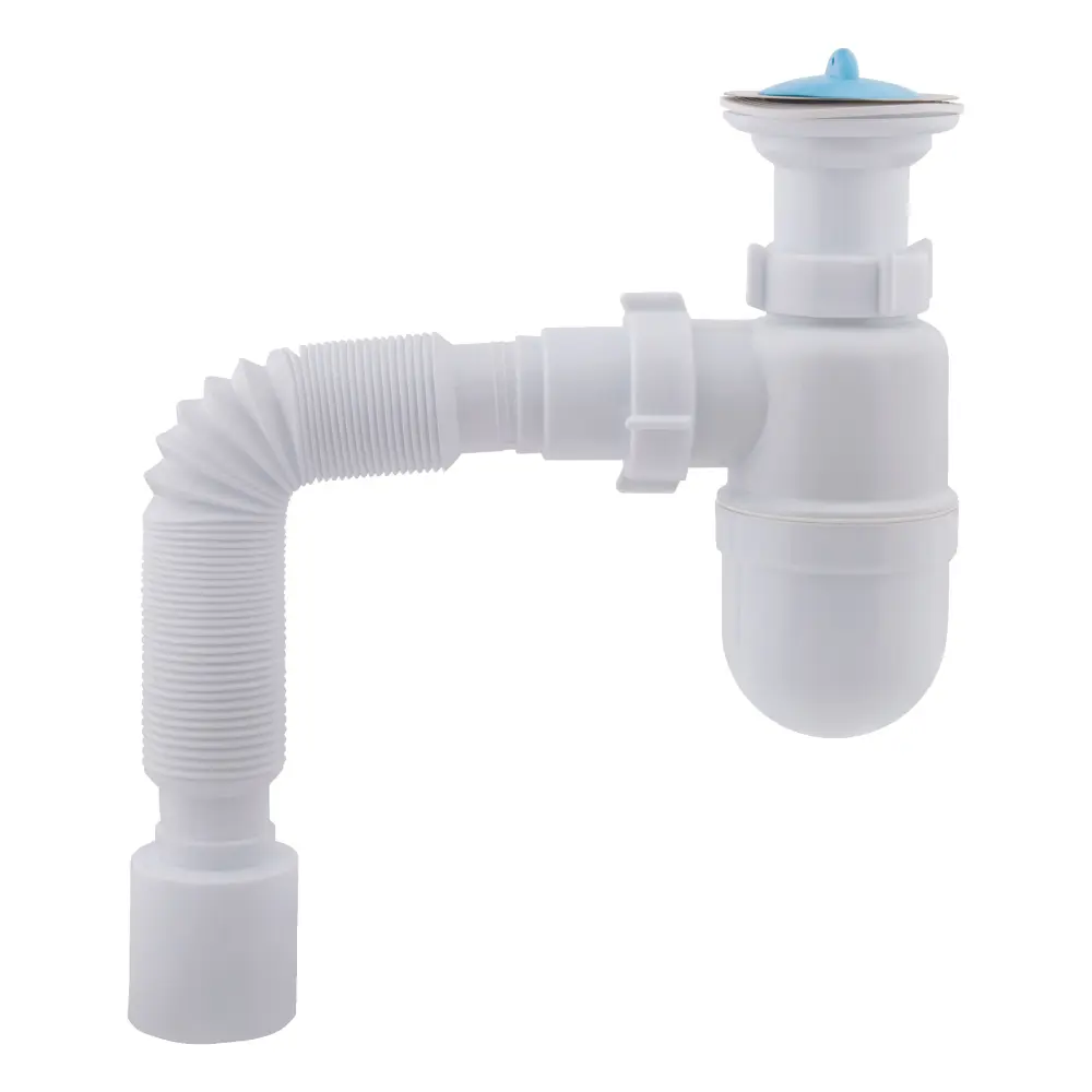 Сифон Krono Plast У1050 выполнен в виде колбы из пластика классического белого цвета, имеет гладкую внутреннюю поверхность, не только делает его по сходной цене, но и препятствует накоплению грязи на стенах. Кроме того, резервуар колбы легко снимается для очистки от оседлых твердых частиц. Гофрированный выход дает возможность изменять длину и угол трубы. Открытие или закрытие сливного отверстия происходит вручную с помощью пробки для слива.
