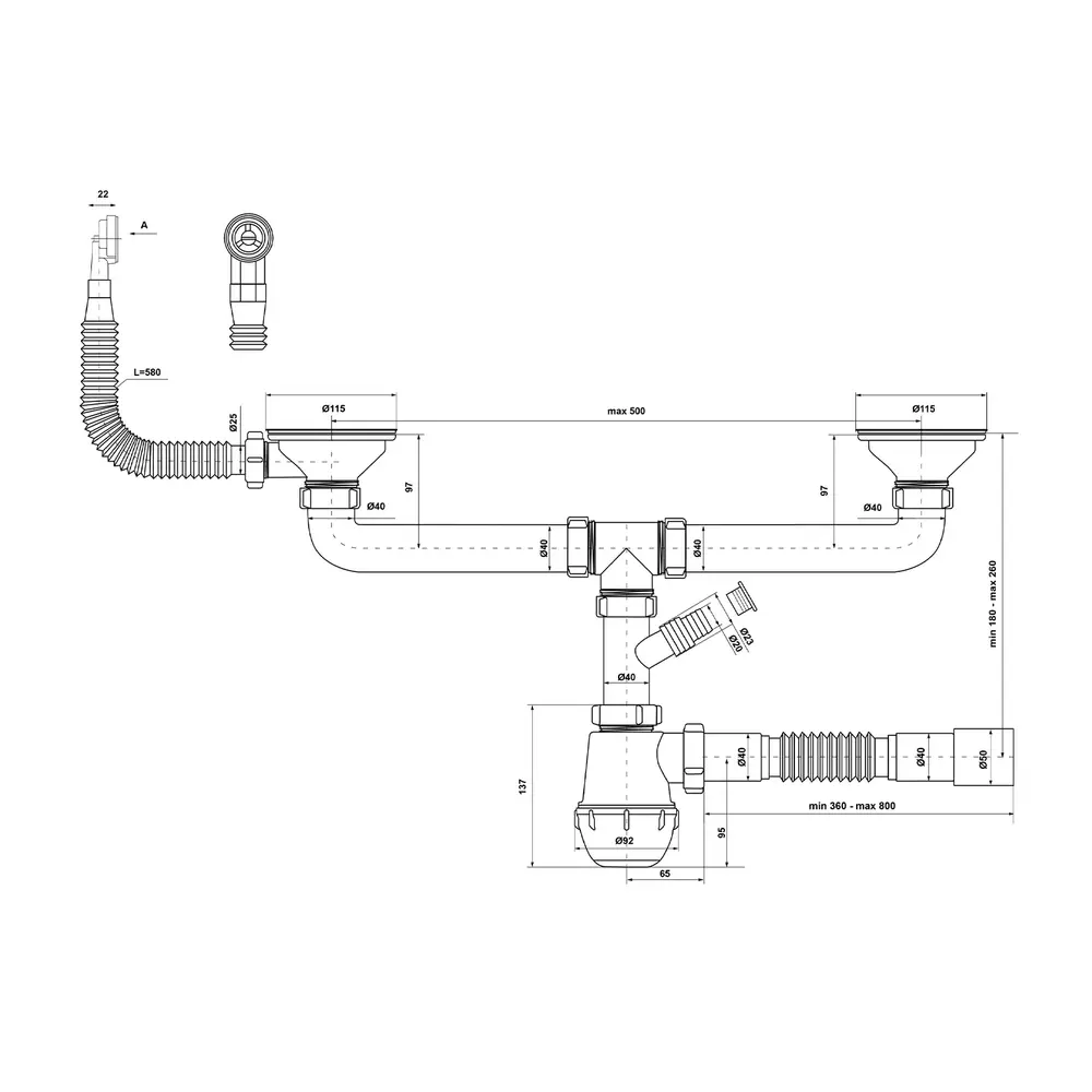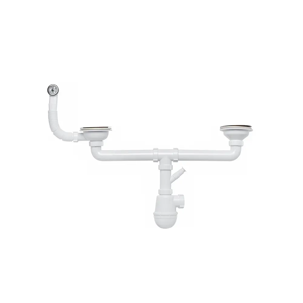 Сифон для кухонных моек с двумя расположенными симметрично и на одном уровне резьбовыми выпусками, с отводом для подключения стиральной машины и гибким круглым переливом. Для подключения к канализации комплектуется гофротрубой. Если отвод для стиральной машины не используется, то для его надежного закрытия используют полипропиленовую пробку идущую в комплекте. Сетки выпуска, винты и гайки из нержавеющей стали.