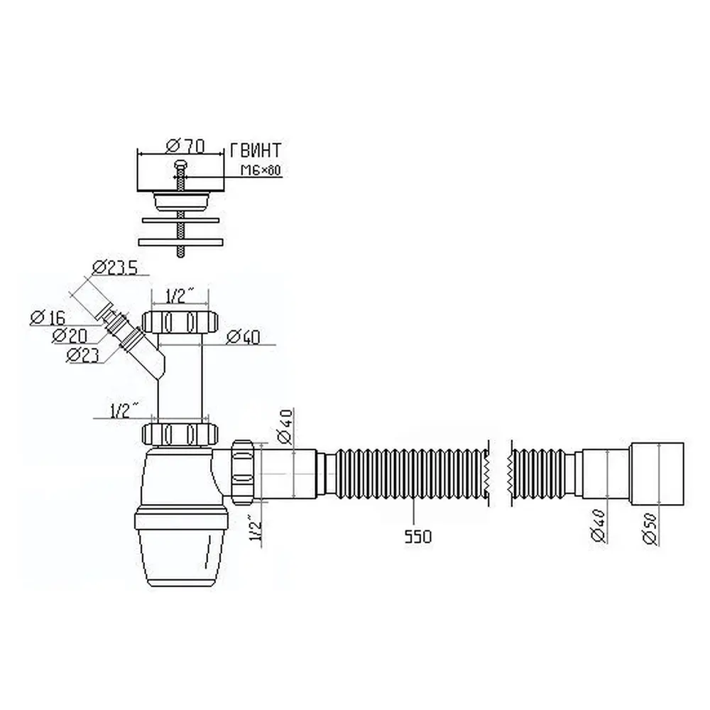 Сифон Waterstal (А - 40059) 1 1/2 40/50 для мойки с гибкой труб. под стиральную маш. нерж болт 8 см
