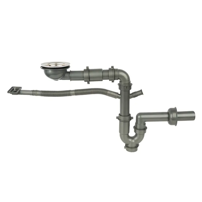 Ідеально підійшов і до мийки і до виходу труби з каналізації. Все в сборі, нічого не докуповував. Поставив і забув.