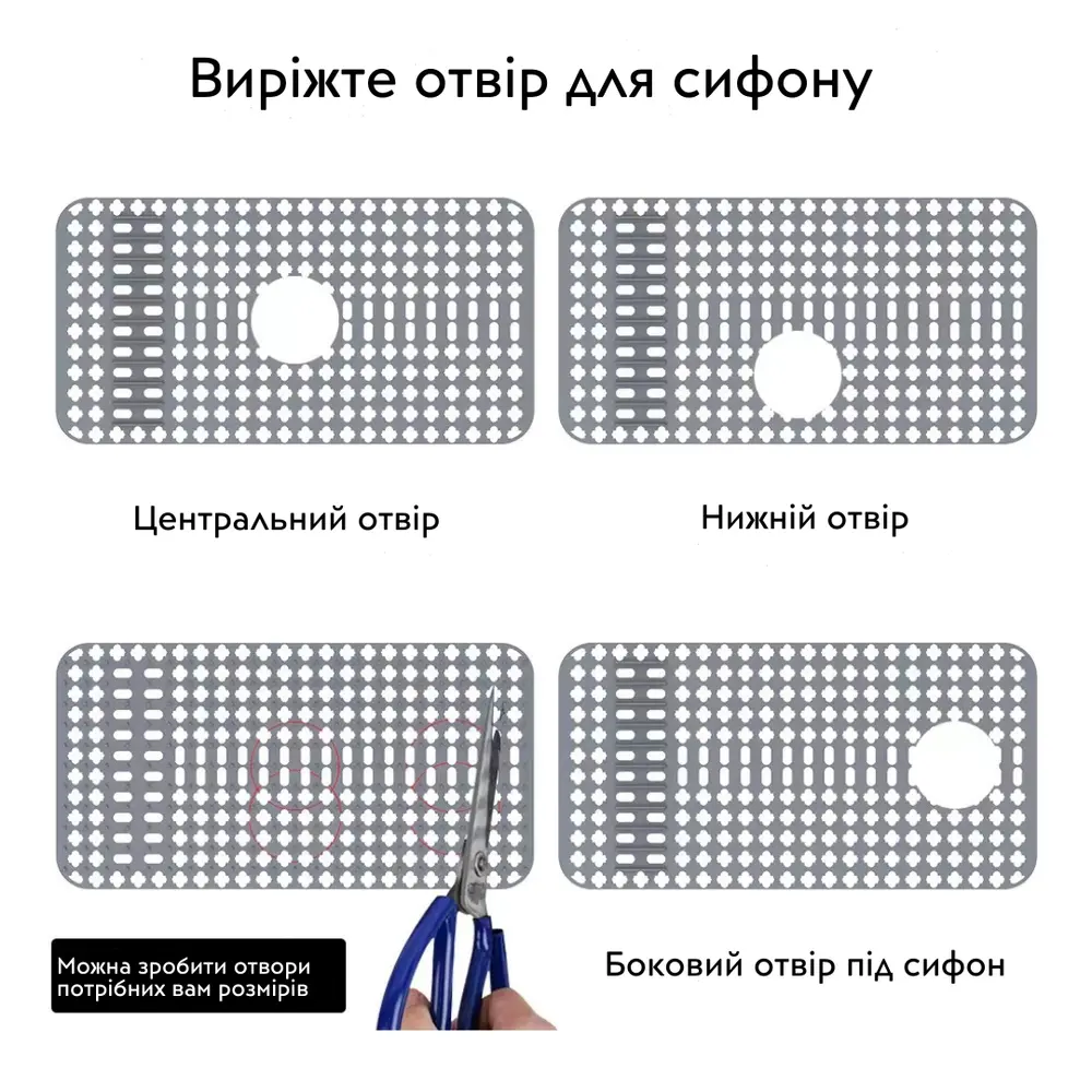 Килимок підійде під будь-яку мийку,бо може підрізатись звичайними ножицями.