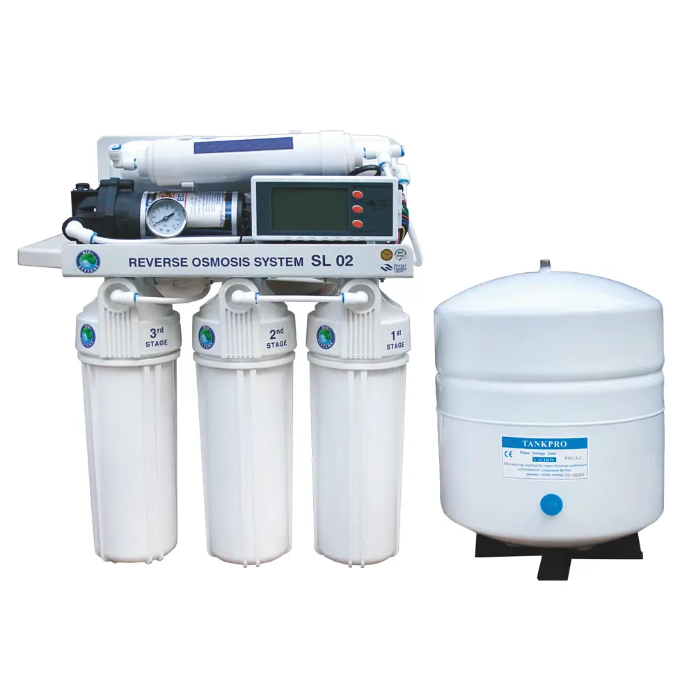 Система комплектуется многофункциональным цифровым дисплеем с функцией автоматического напоминания о замене всех картриджей и мембраны, со встроенным датчиком TDS.