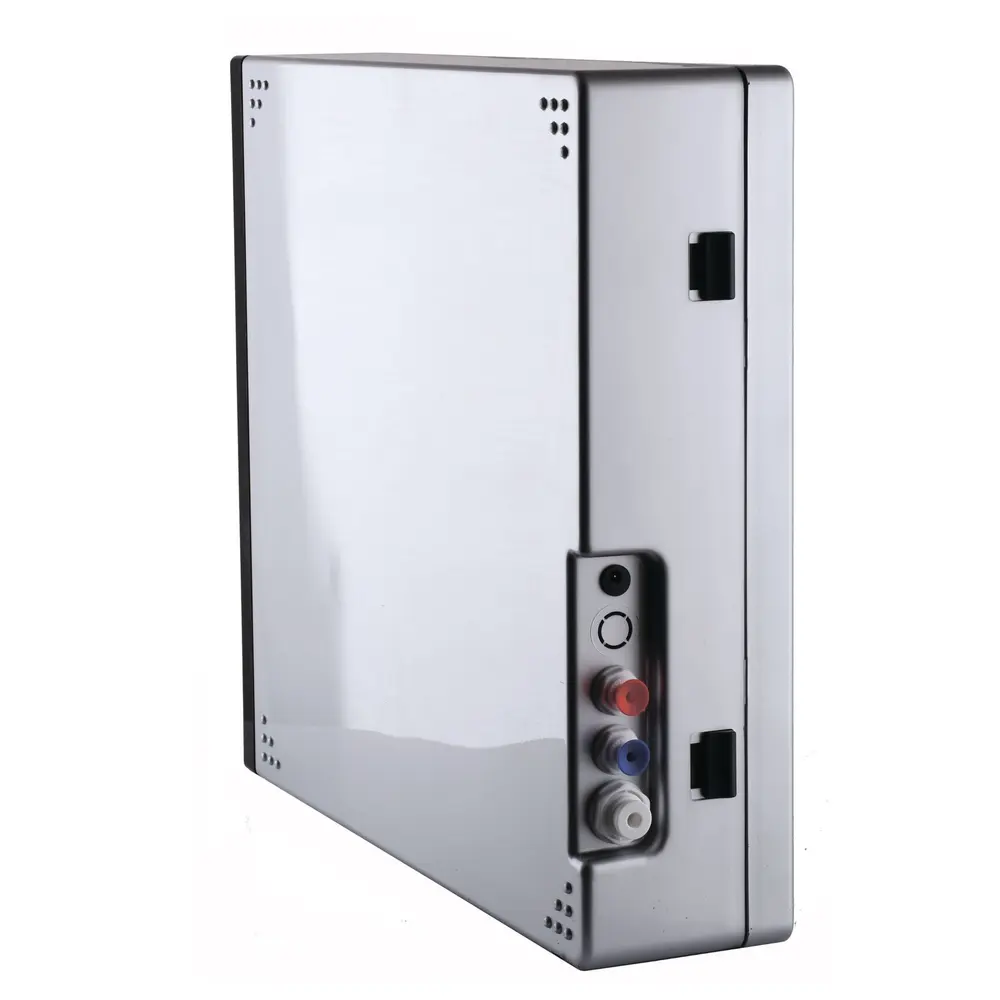 компактные размеры: ширина 105 мм, высота 390 мм, глубина 435 мм (легко устанавливается в пространство под мойкой или в настольном варианте, как вертикальном, так и в горизонтальном положении)