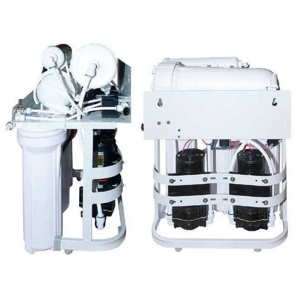 < br /> Система обратного осмоса BIO + Systems RO600G-P01 является полностью автоматизированной системой очистки воды, предназначенной для работы практически в любых условиях, благодаря оснащению двумя повышают насосами. Возможна эксплуатация даже при недостаточном давлении воды в водопроводе. Две мембраны обратного осмоса обеспечивают высокую производительность 2260 л / сутки, что позволяет эксплуатировать систему без накопительного бака для воды, получая очищенную воду в реальном времени.