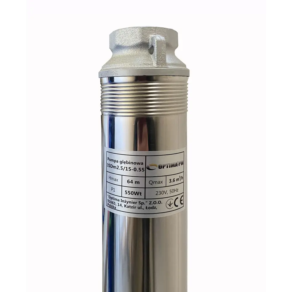 Насос скважинный с повышенной устойчивостью к песку OPTIMA PM 3SDm2.5 / 15 0.55 кВт 65м диаметром 3 "предназначен для подачи воды из скважин (диаметром от 3" или 76 мм) и открытых водоемов с глубиной более 9 м, когда использование поверхностного насоса невозможно или нецелесообразно.