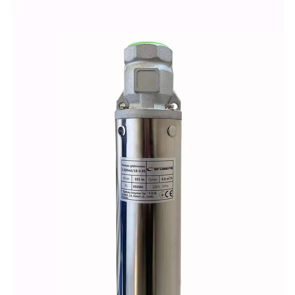 Насос OPTIMA PM 3.5SDm3 / 18 0.95 кВт112м складається з двох частин: двигун в нижній частині і насос у верхній частині, жорстко зєднані між собою зубчастої муфтою міжнародного стандарту Nema і має забір води в середній частині корпусу. Насос относятітся до насосів відцентрового типу і має багатоступеневу конструкцію і «плаваючі» робочі колеса, завдяки яким реалізується підвищена стійкість до піску (до 1500 г / м3).