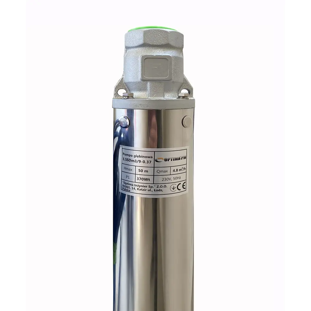 Насос OPTIMA PM 3.5SDm3 / 9 0.37 кВт 55м складається з двох частин: двигун в нижній частині і насос у верхній частині, жорстко зєднані між собою зубчастої муфтою міжнародного стандарту Nema і має забір води в середній частині корпусу. Насос относятітся до насосів відцентрового типу і має багатоступеневу конструкцію і «плаваючі» робочі колеса, завдяки яким реалізується підвищена стійкість до піску (до 1500 г / м3).