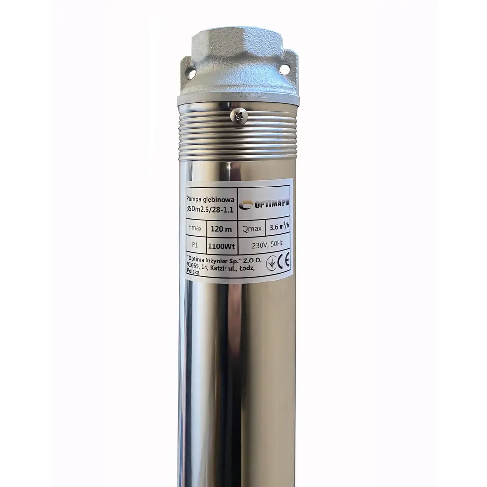 Насос OPTIMA PM 3SDm2.5 / 28 1.1 кВт 135м складається з двох частин: двигун в нижній частині і насос у верхній частині, жорстко зєднані між собою зубчастої муфтою міжнародного стандарту Nema і має забір води в середній частині корпусу. Насос относятітся до насосів відцентрового типу і має багатоступеневу конструкцію і «плаваючі» робочі колеса, завдяки яким реалізується підвищена стійкість до піску (до 1000 г / м3).