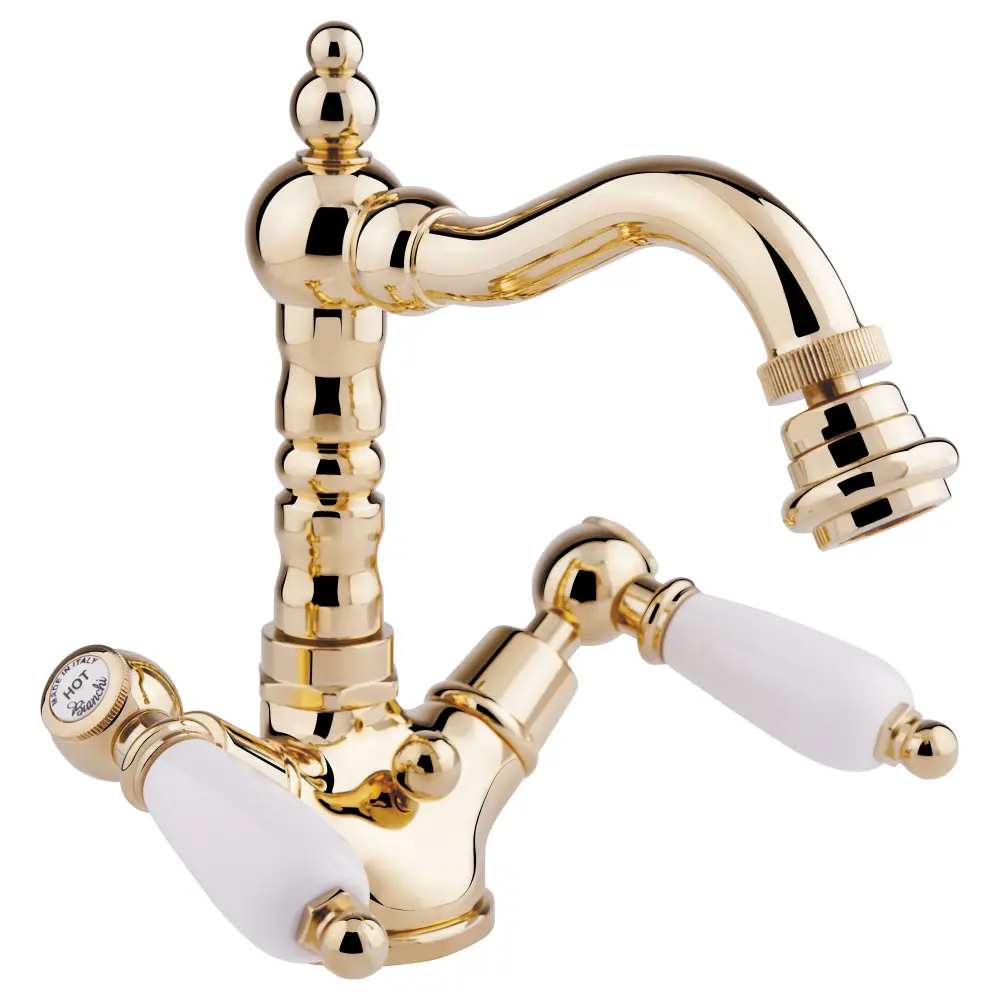 Смеситель для биде Bianchi First BIDFRS1037 # 026IAORO выполнен с белыми вентильными ручками и глянцевой золотой поверхностью, которая выглядит много и сделает интерьер королевским. Подойдет для ванны в стиле ретро, классика или прекрасно сочетается с ванными аксессуарами такой же модели, или такого же цвета. Поверхность устойчива к коррозии и сохранит свой блеск на долгие годы благодаря изготовлению из латуни, добавлению никеля толщиной 11 мкм и порошковой краски. Изделие монтируется врезным способом на ободок биде.