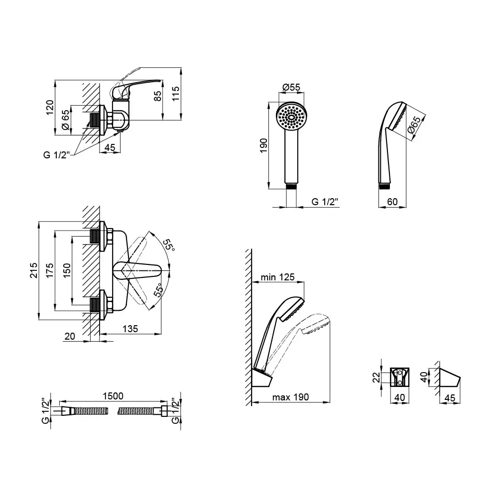 Змішувач, Лійка для ручного душу, Душовий шланг, Тримач для душу, Кріплення