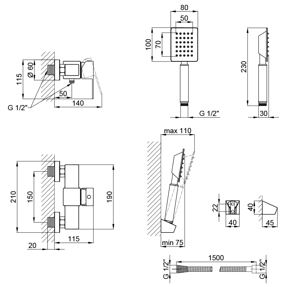 Змішувач, Лійка для ручного душу, Душовий шланг, Кронштейн, Кріпильні деталі