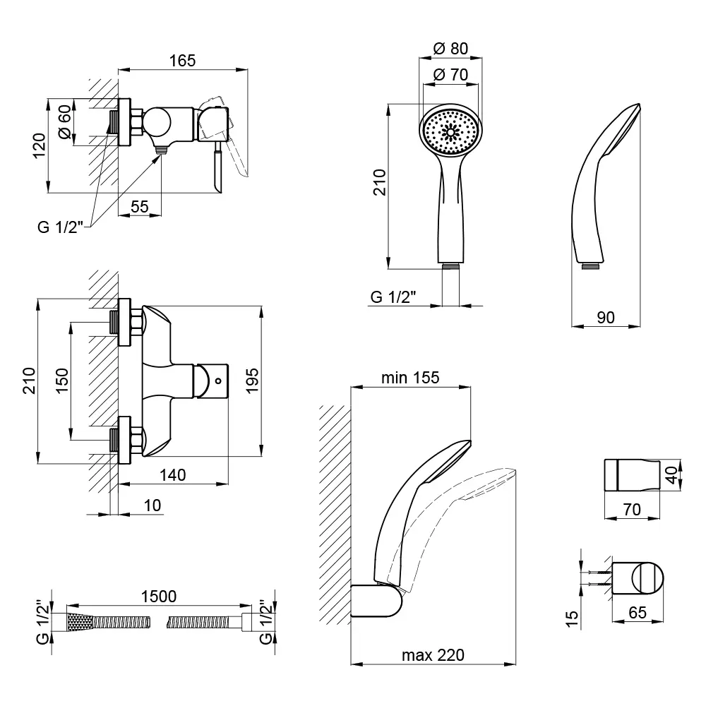 Змішувач, Лійка для ручного душу, Душовий шланг, Кронштейн, Кріпильні деталі