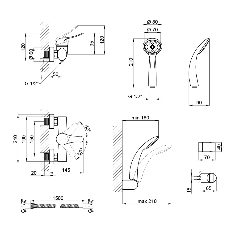 Змішувач, Лійка для ручного душу, Душовий шланг, Кронштейн, Кріпильні деталі
