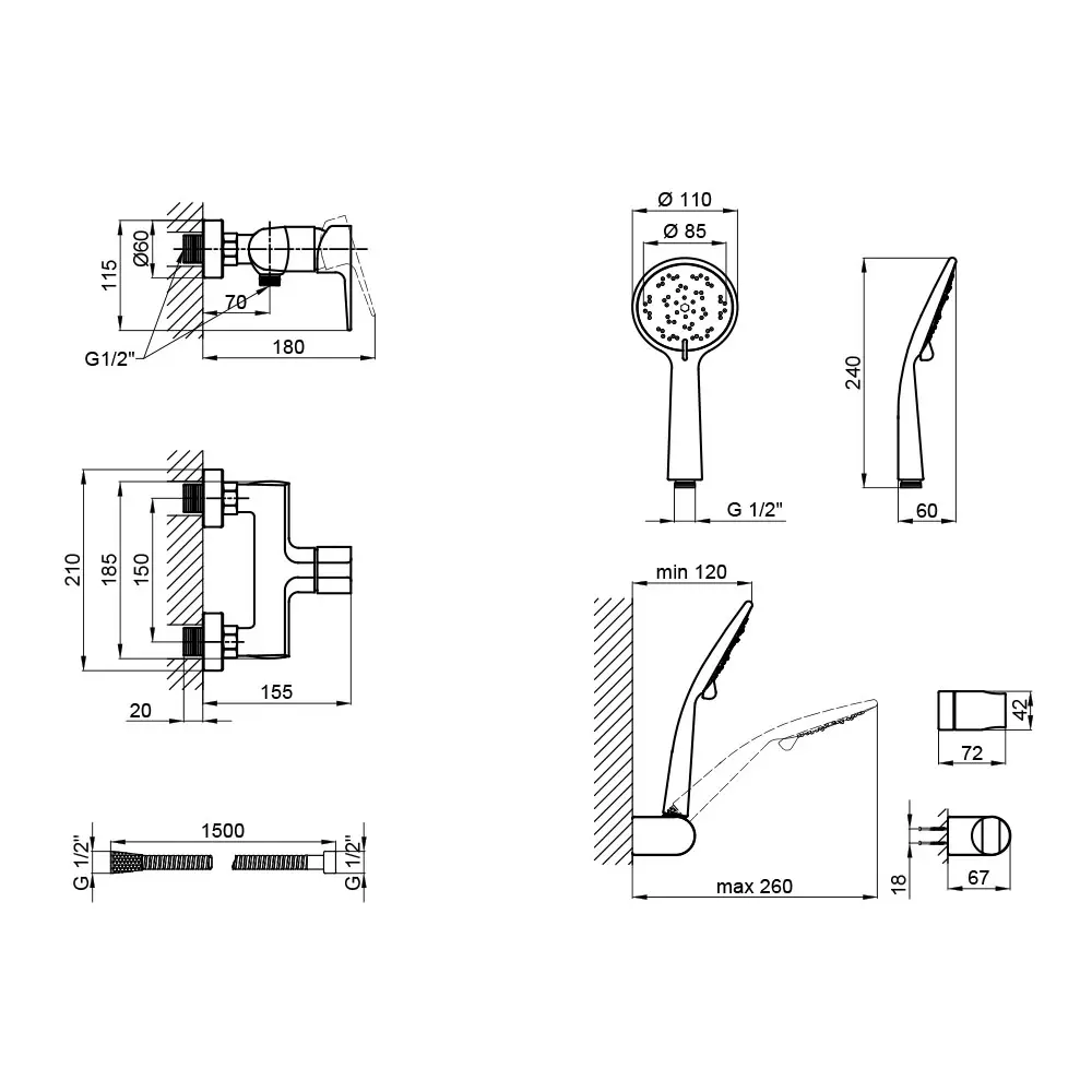 Змішувач, Лійка для ручного душу, Душовий шланг, Кронштейн, Кріпильні деталі