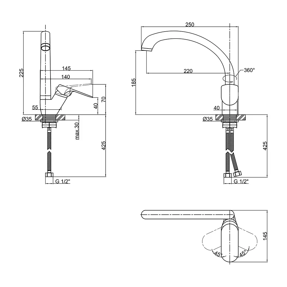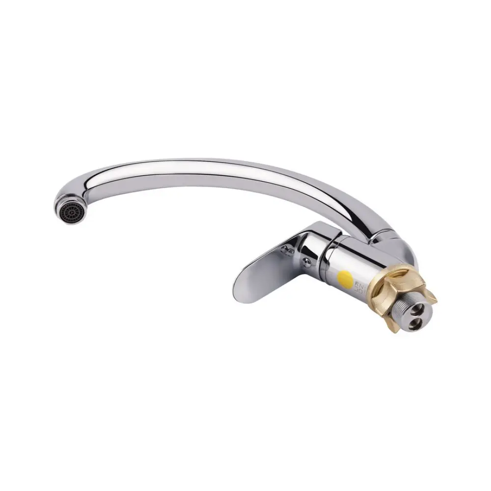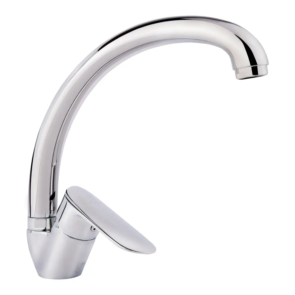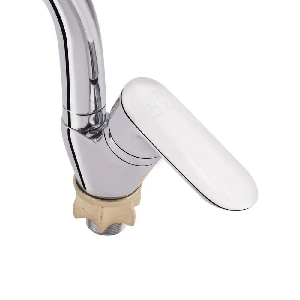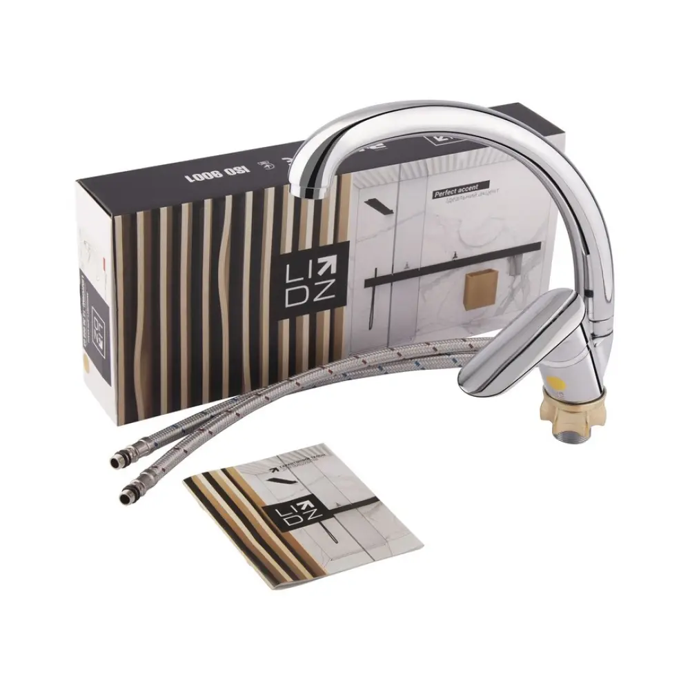 Смеситель для кухни с высоким поворотным изливом Lidz (CRM) 15 36 008 03 позволит набирать воду в высокую посуду, а благодаря глянцевой блестящей поверхности выглядит эстетично и дополнит любой интерьер комнаты. Он монтируется в отверстие для смесителя на столешнице или на мойке врезным способом. Напор воды и ее температура регулируются поворотом рычага в нужное положение. Он нанесены маркировки Х + Г воды и фирменный логотип производителя.