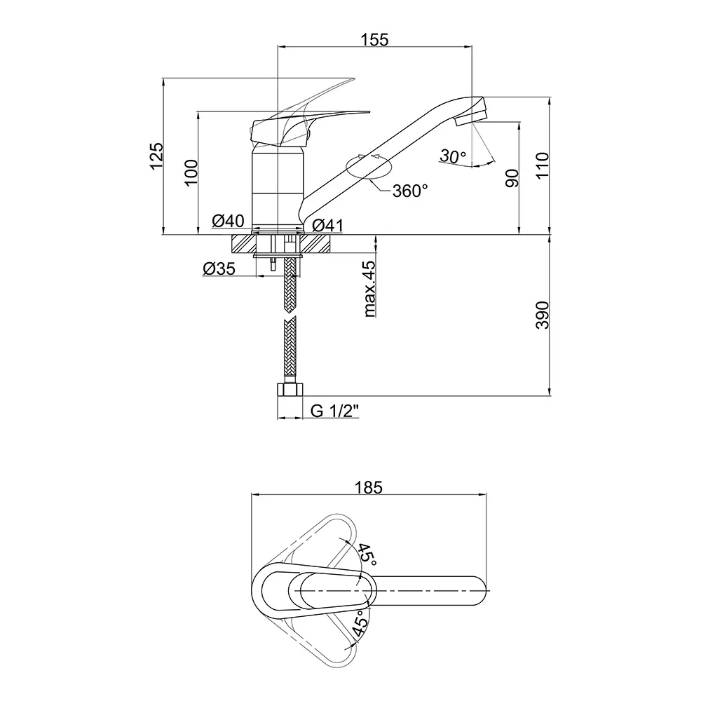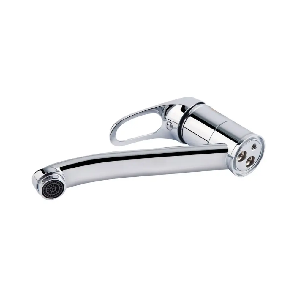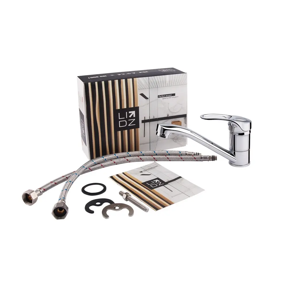Смеситель для кухни с поворотным изливом Lidz (CRM) 16 37 002 01 выполнен из глянцевой блестящей поверхностью. Он монтируется над кухонной мойкой в столешницу врезным способом. Подача воды включается благодаря картриджа после поворота рычага в нужное положение. Для удобства на него нанесена маркировка Х + Г воды и добавлено отверстие против скольжения мыльных рук.