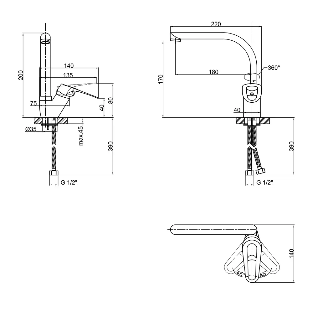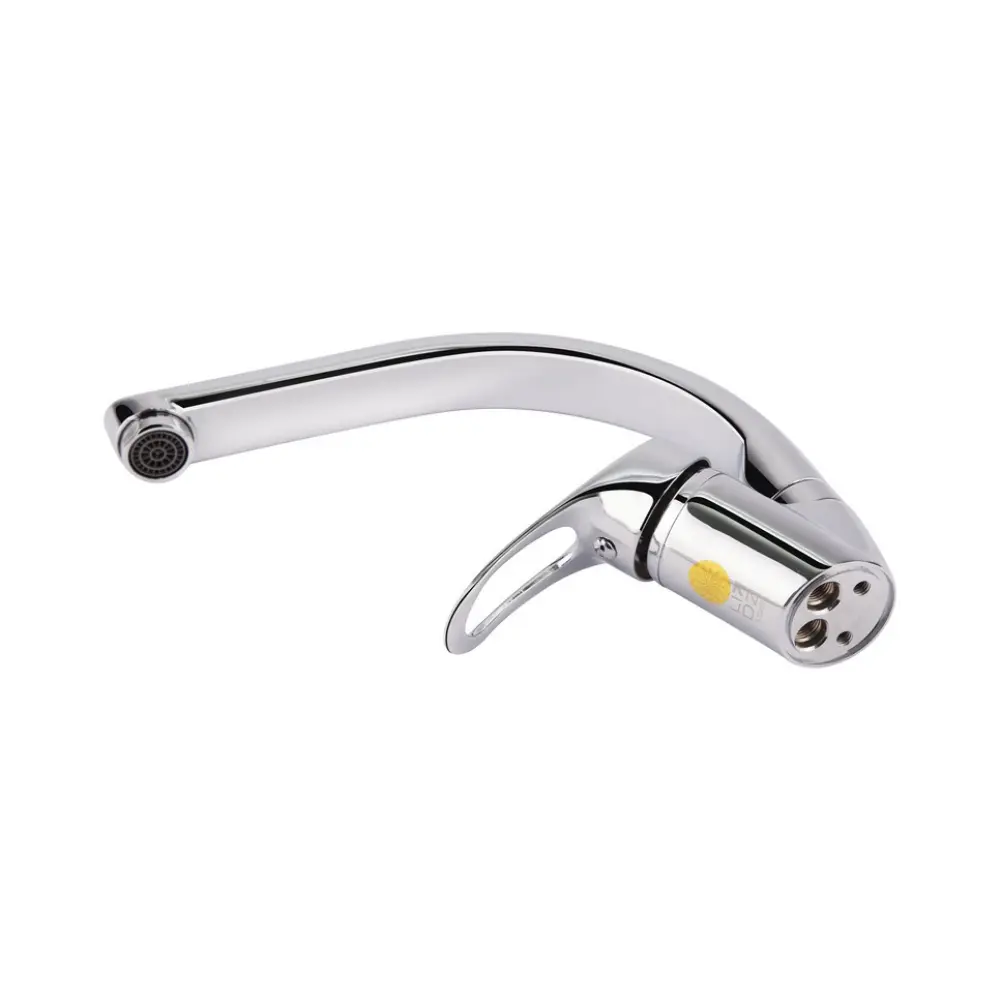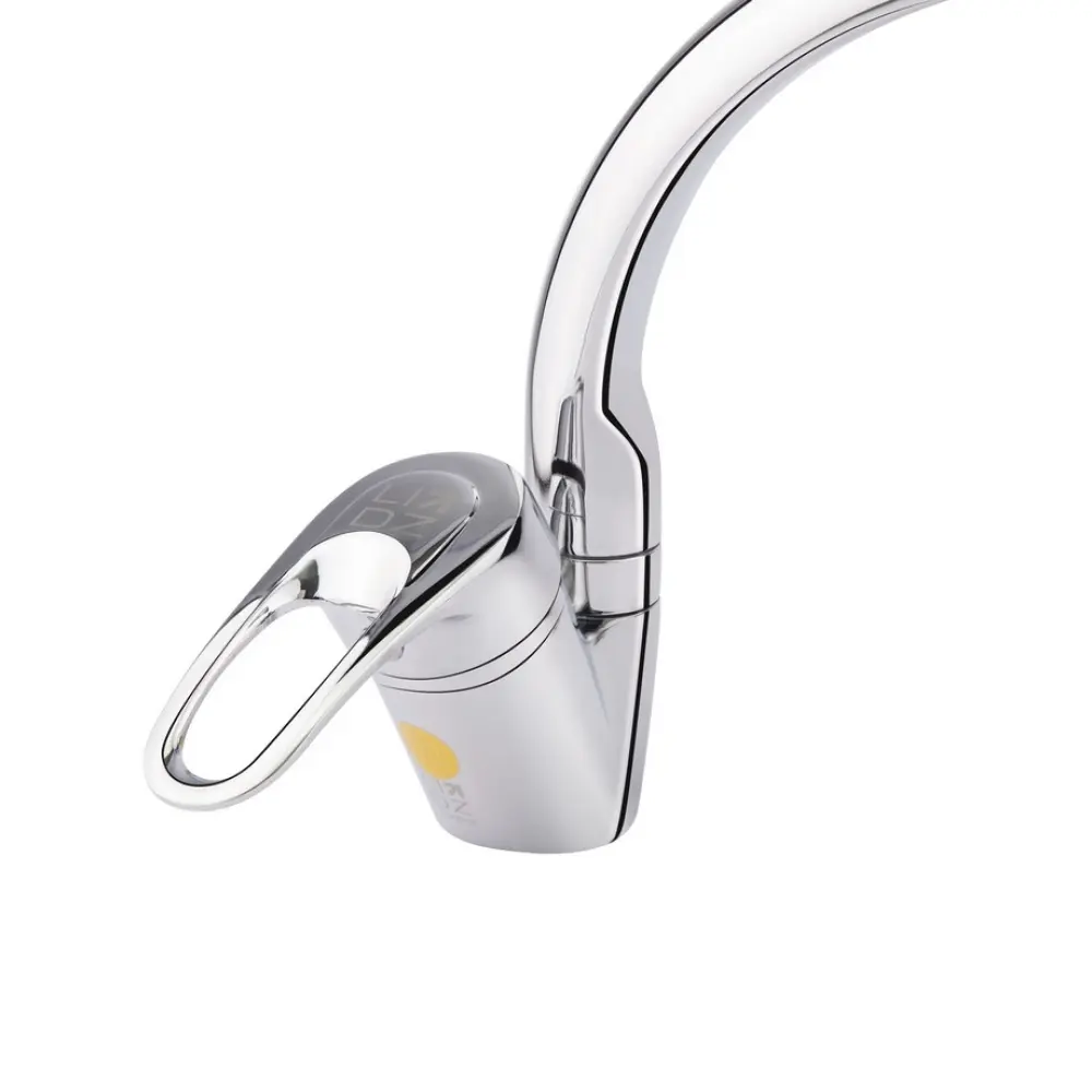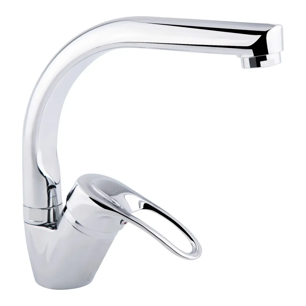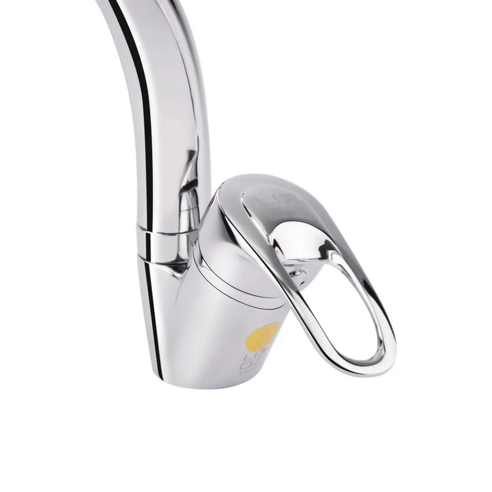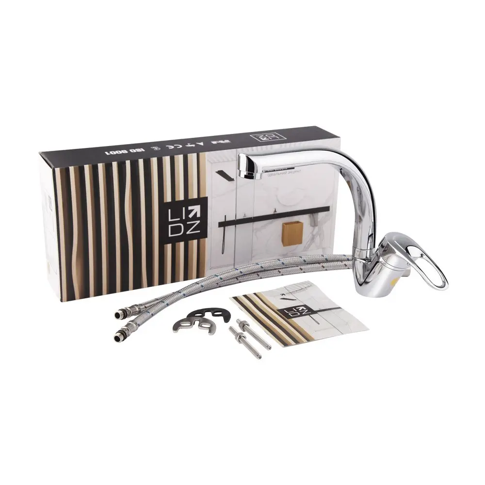Смеситель для кухни с оригинальным поворотным изливом Lidz (CRM) 16 37 007 06 позволит набрать воду в высокую посуду, а благодаря глянцевой блестящей поверхности выглядеть эстетично и дополнит любой интерьер комнаты. Он монтируется в отверстие для смесителя на столешнице или на мойке врезным способом. Напор воды и ее температура регулируются поворотом рычага с отверстием в нужном направлении. Он нанесены маркировки Х + Г воды и фирменный логотип производителя.