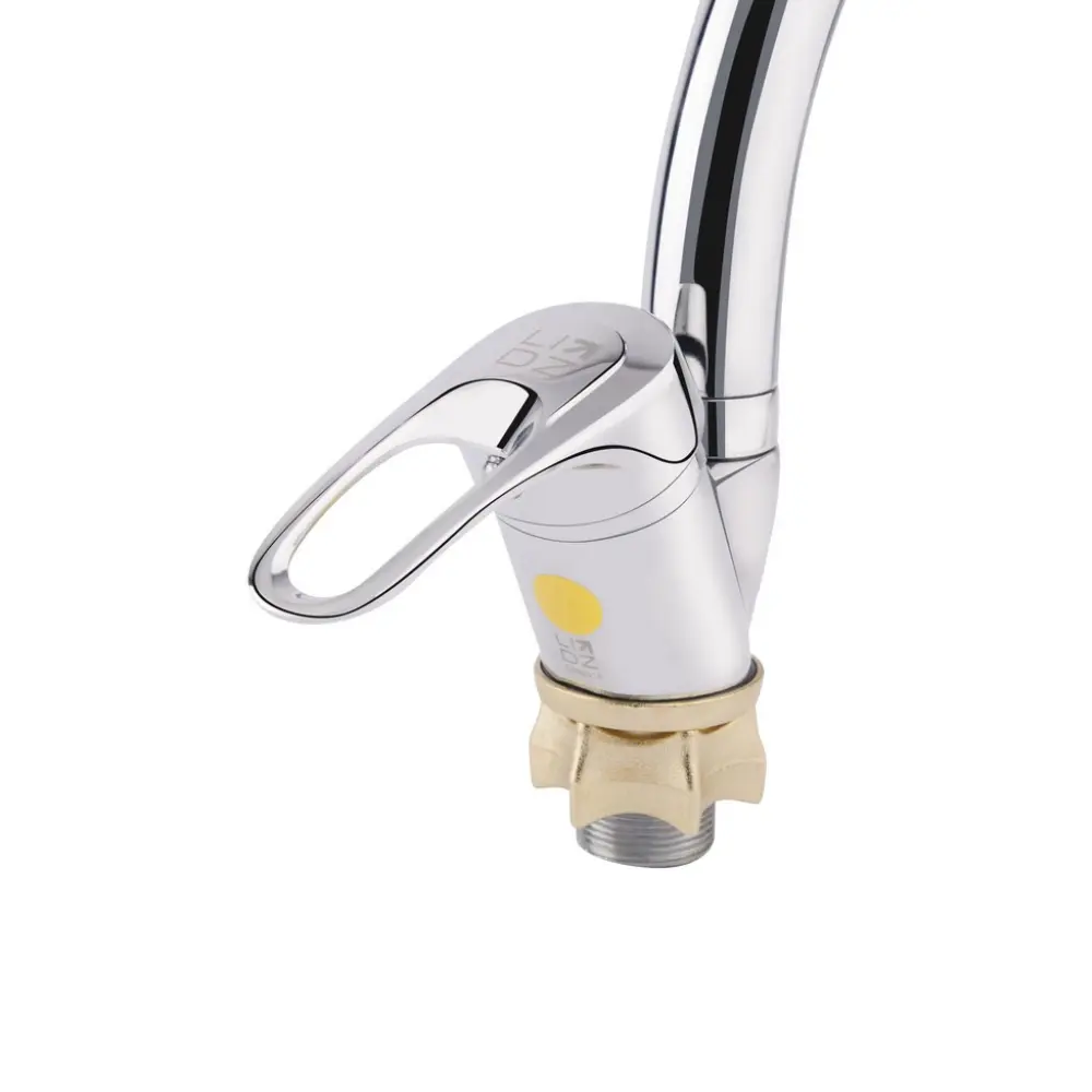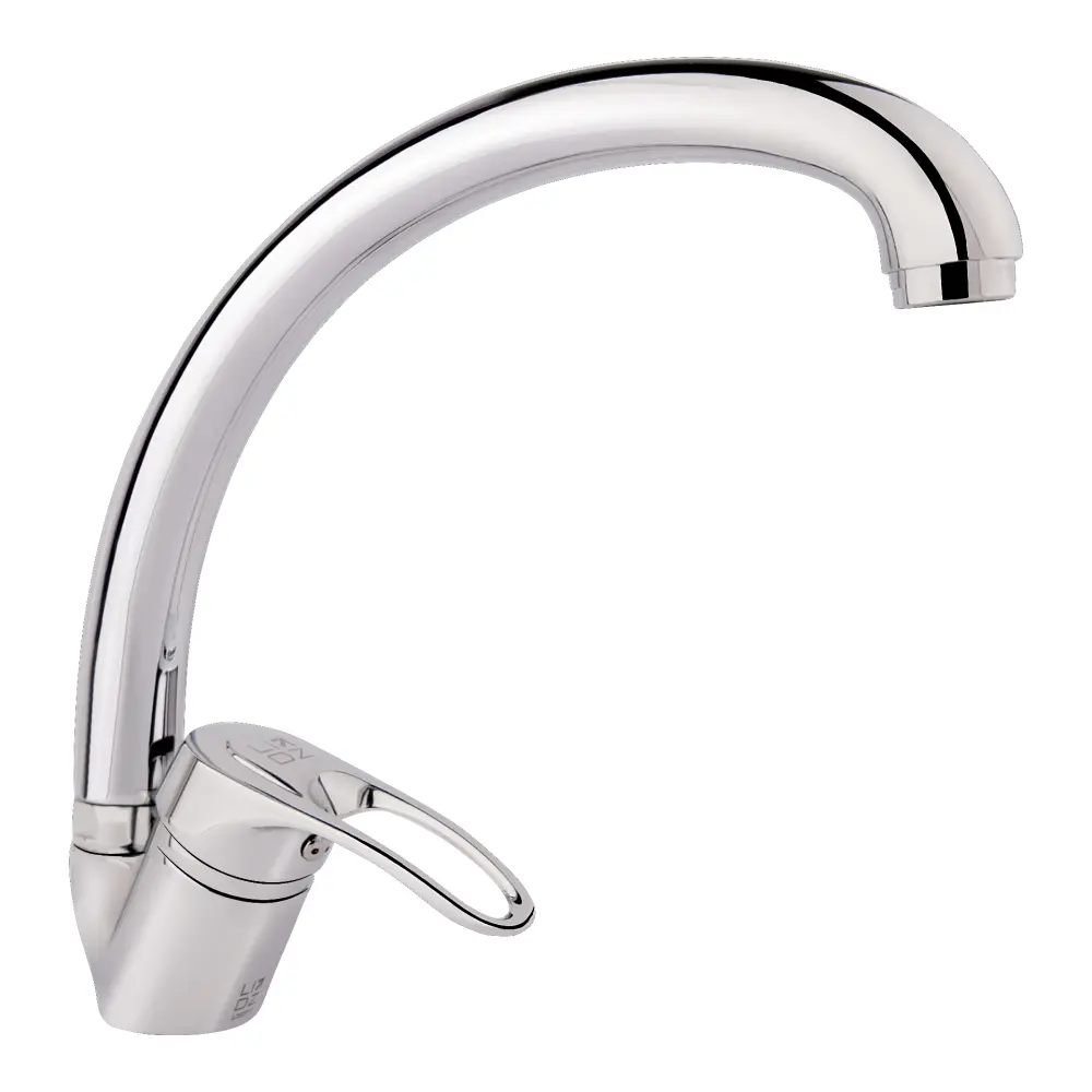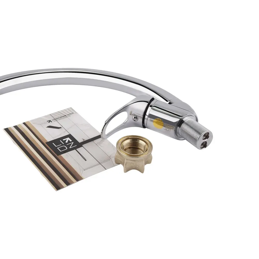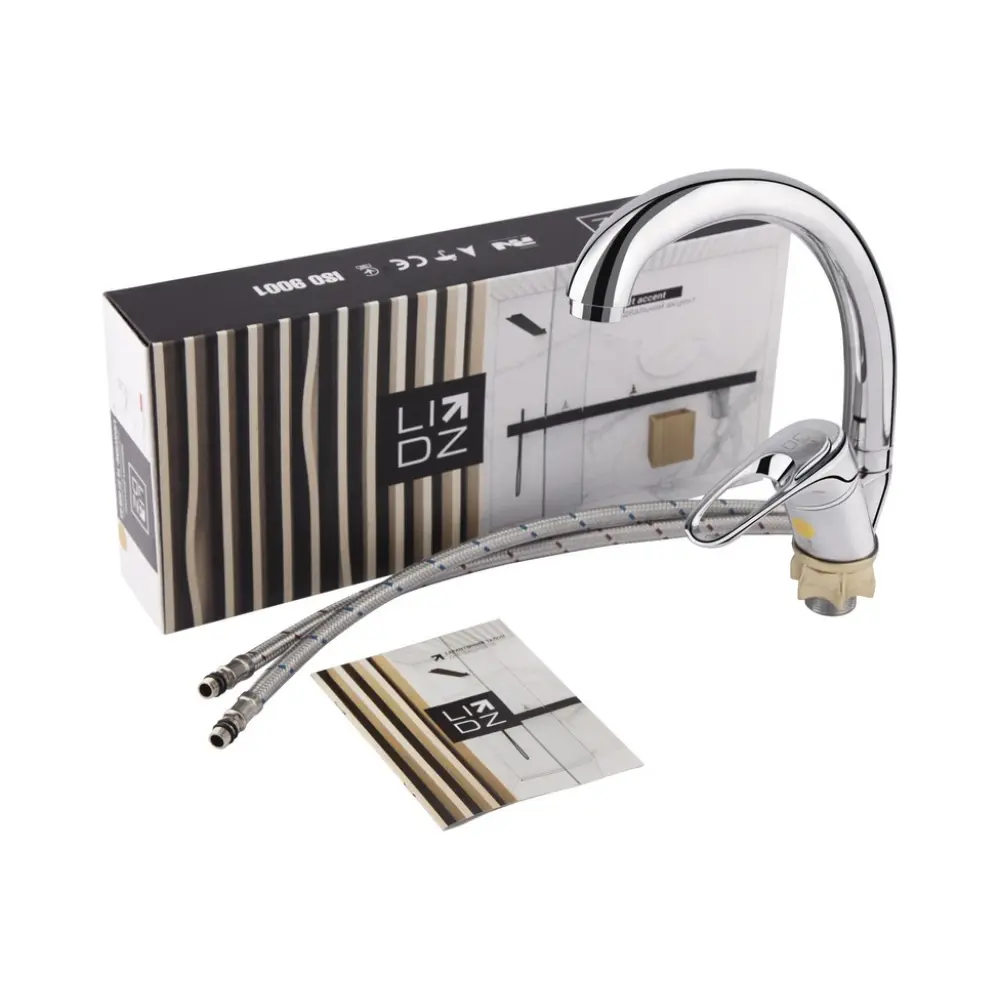 Смеситель для кухни с высоким поворотным изливом Lidz (CRM) 16 37 008 03 выполнен из глянцевой блестящей поверхностью. Он монтируется над кухонной мойкой в столешницу врезным способом. Подача воды включается благодаря картриджа после поворота рычага в нужное положение. Для удобства на него нанесена маркировка Х + Г воды и добавлено отверстие против скольжения мыльных рук.