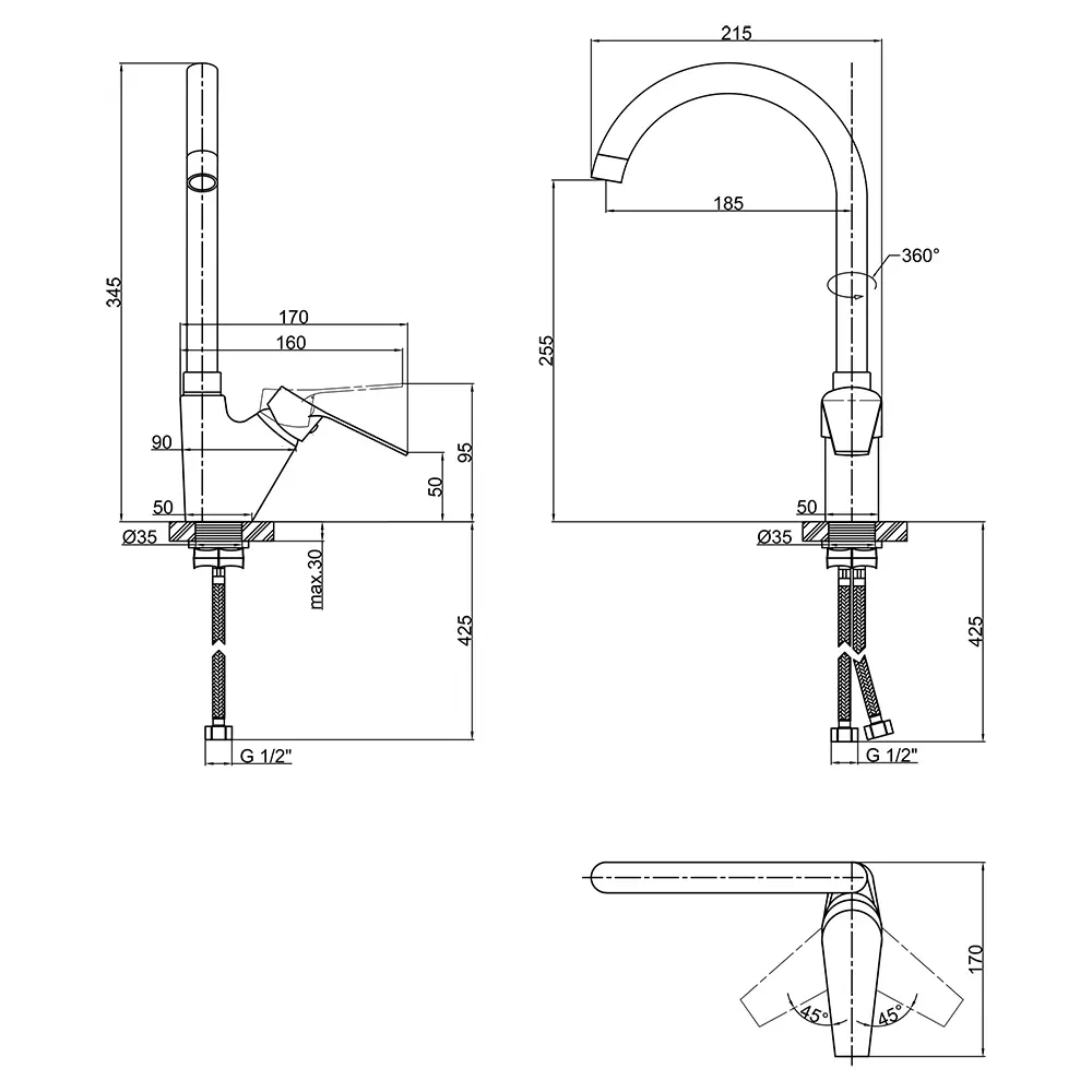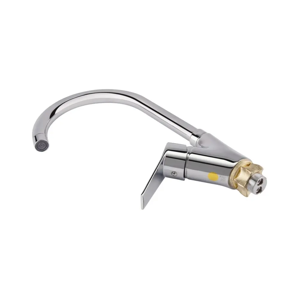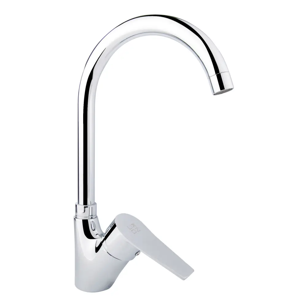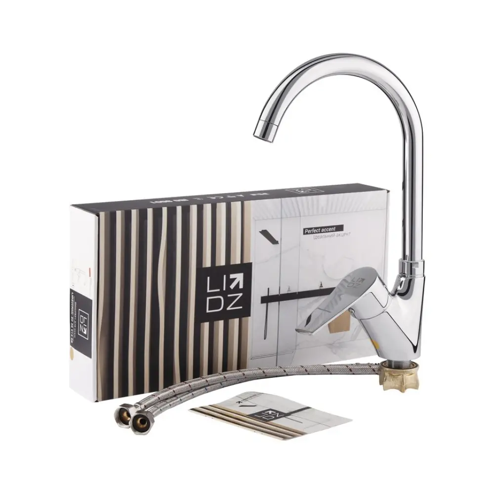 Смеситель для кухни с высоким поворотным изливом Lidz (CRM) 20 38 012 08 позволит набрать воду в высокую посуду и, благодаря глянцевой блестящей поверхности, будет выглядеть эстетично и дополнит любой интерьер комнаты. Смеситель монтируется в отверстие для смесителя в столешнице врезным способом. Напор воды и ее температура регулируются поворотом рычага с нанесенным маркировкой Х + Г воды в необходимое положение.