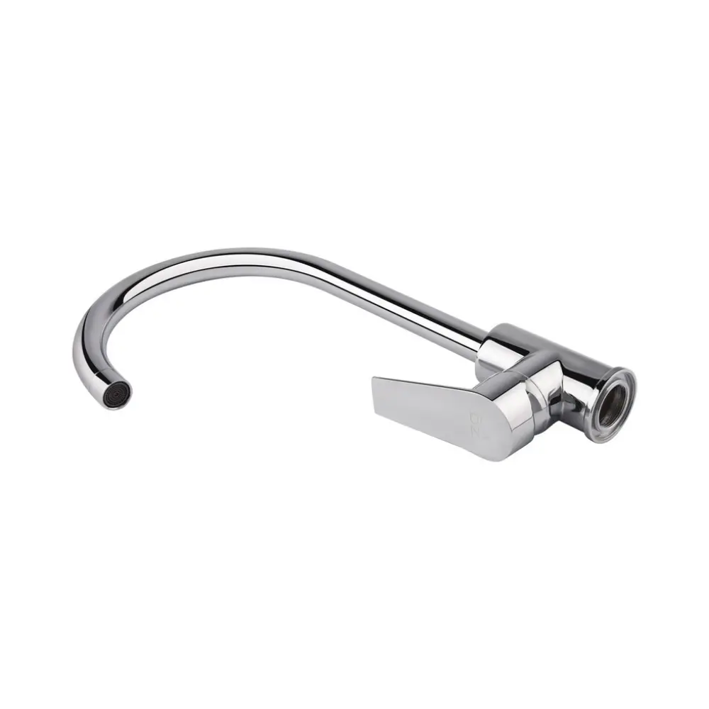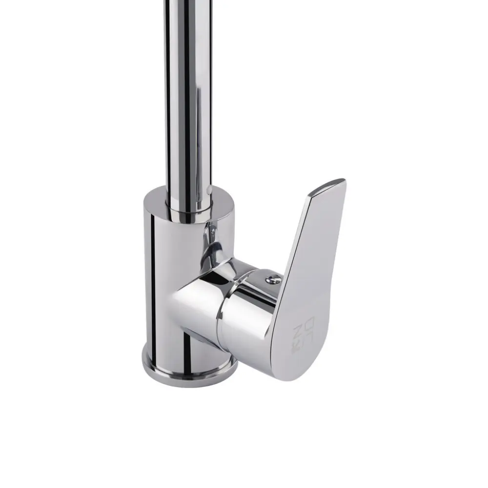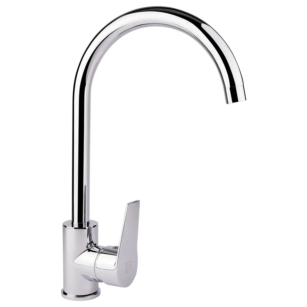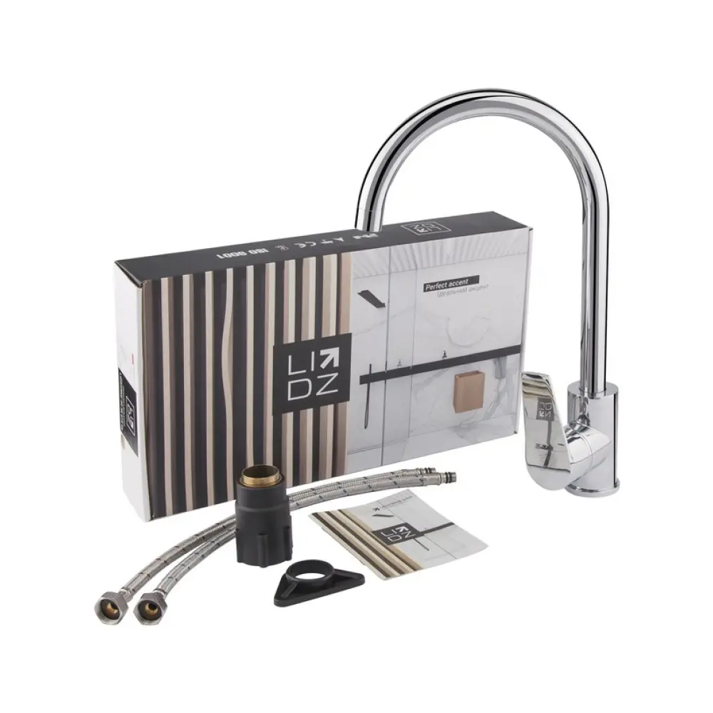 Смеситель для кухни с высоким поворотным изливом Lidz (CRM) 20 38 015 08 позволит набрать воду в высокую посуду и, благодаря глянцевой блестящей поверхности, будет выглядеть эстетично, и дополнит любой интерьер комнаты. Смеситель монтируется в отверстие для смесителя в столешнице врезным способом. Напор воды и ее температура регулируются поворотом рычага с нанесенными маркировкой Х + Г воды и фирменным логотипом производителя в необходимое положение.