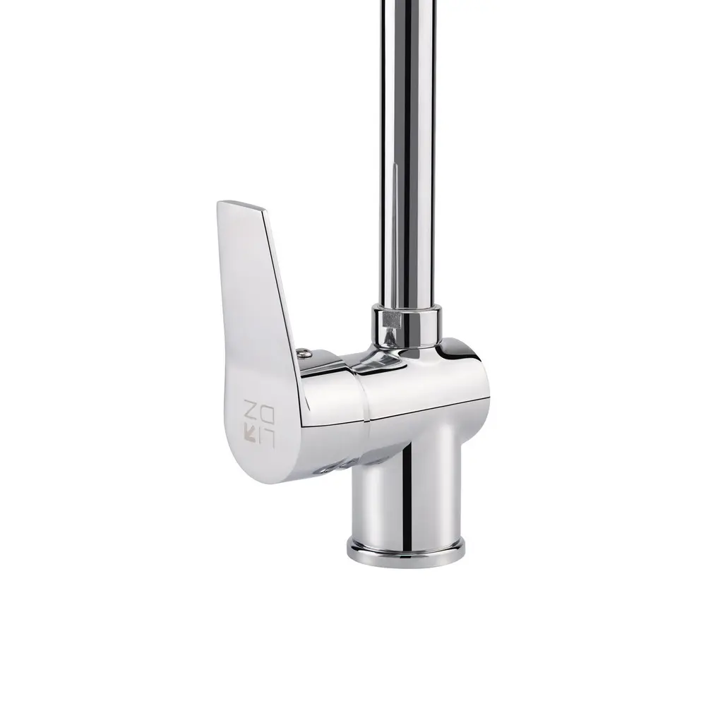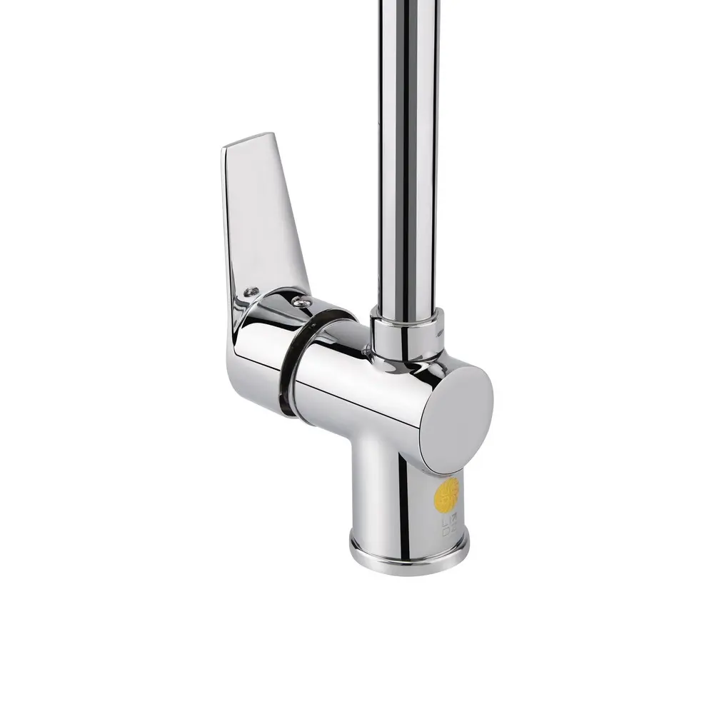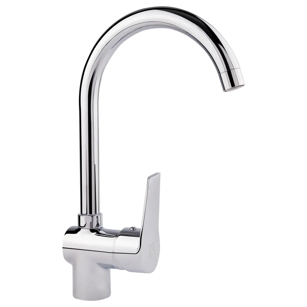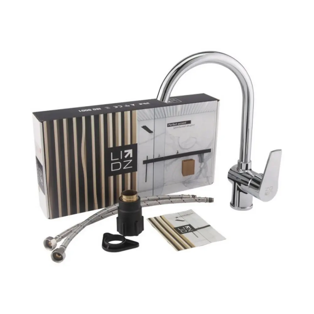 Смеситель для кухни с высоким поворотным изливом Lidz (CRM) 20 38 016 08 позволит набрать воду в высокую посуду и, благодаря глянцевой блестящей поверхности, будет выглядеть эстетично и дополнит любой интерьер комнаты. Смеситель монтируется в отверстие для смесителя в столешнице врезным способом. Напор воды и ее температура регулируются поворотом рычага с нанесенным маркировкой Х + Г воды в необходимое положение.