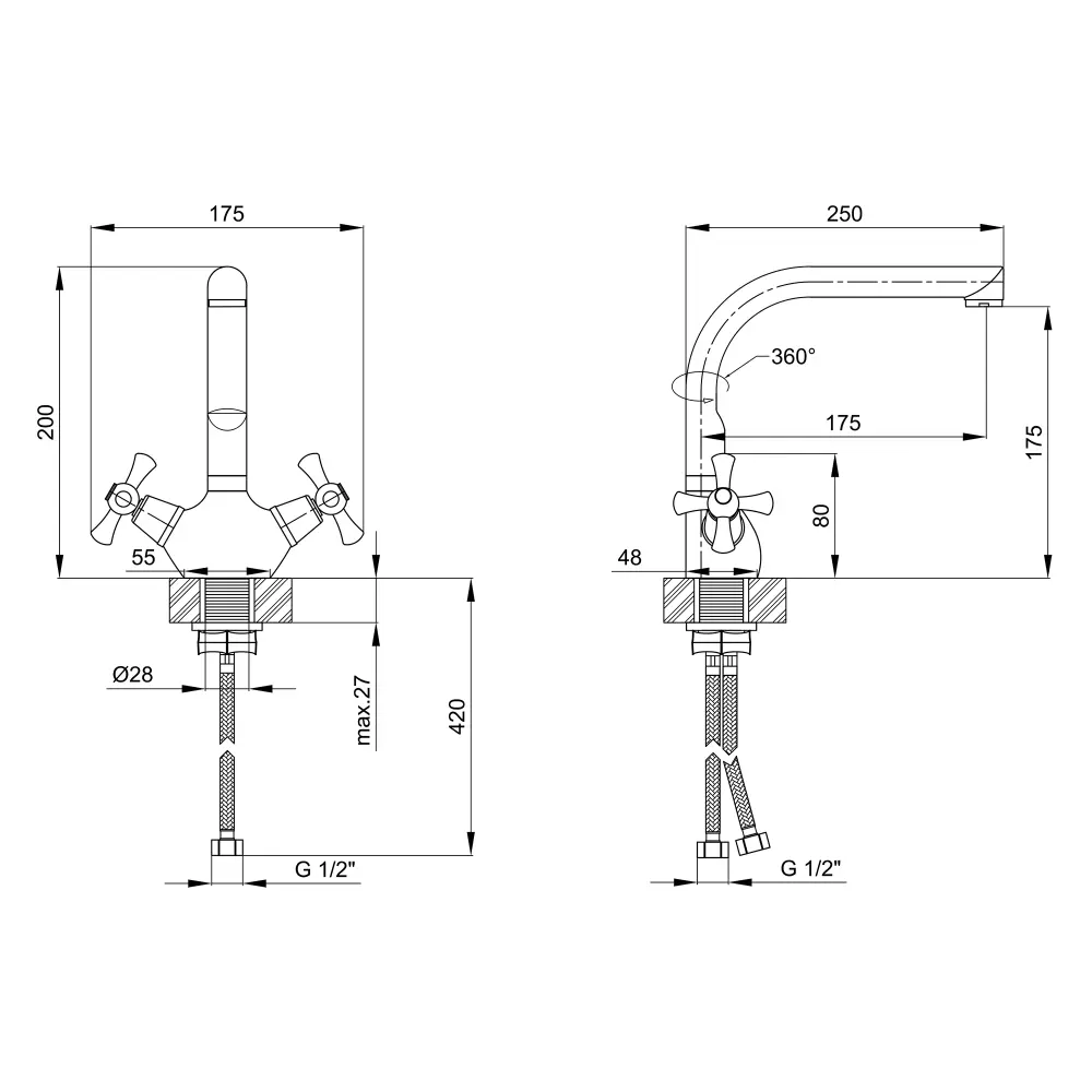 Смеситель для кухни Lidz (CRM) 75 21 271F-6 изготовлен из цинка. Благодаря глянцевой хромированном покрытию имеет оригинальный внешний вид. Выполненный в классическом стиле, с вентильными ручками для регулирования потока холодной и горячей воды.