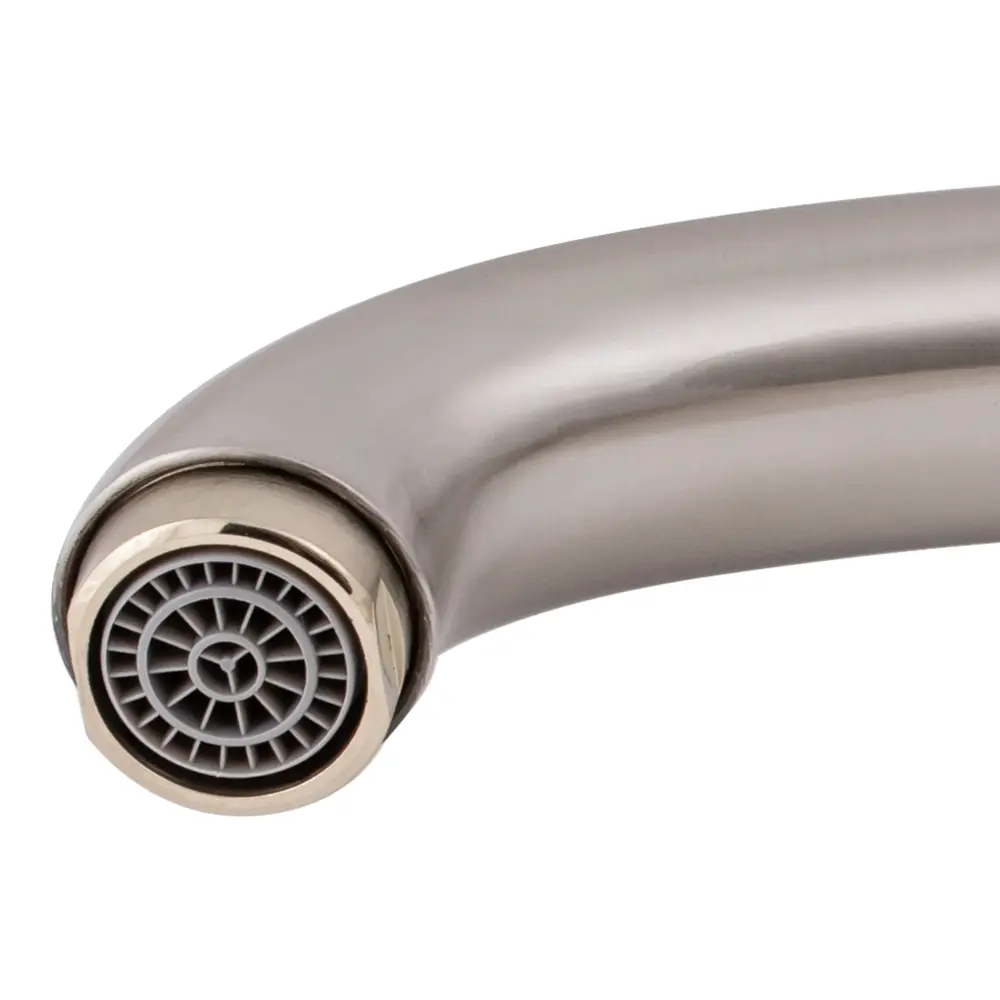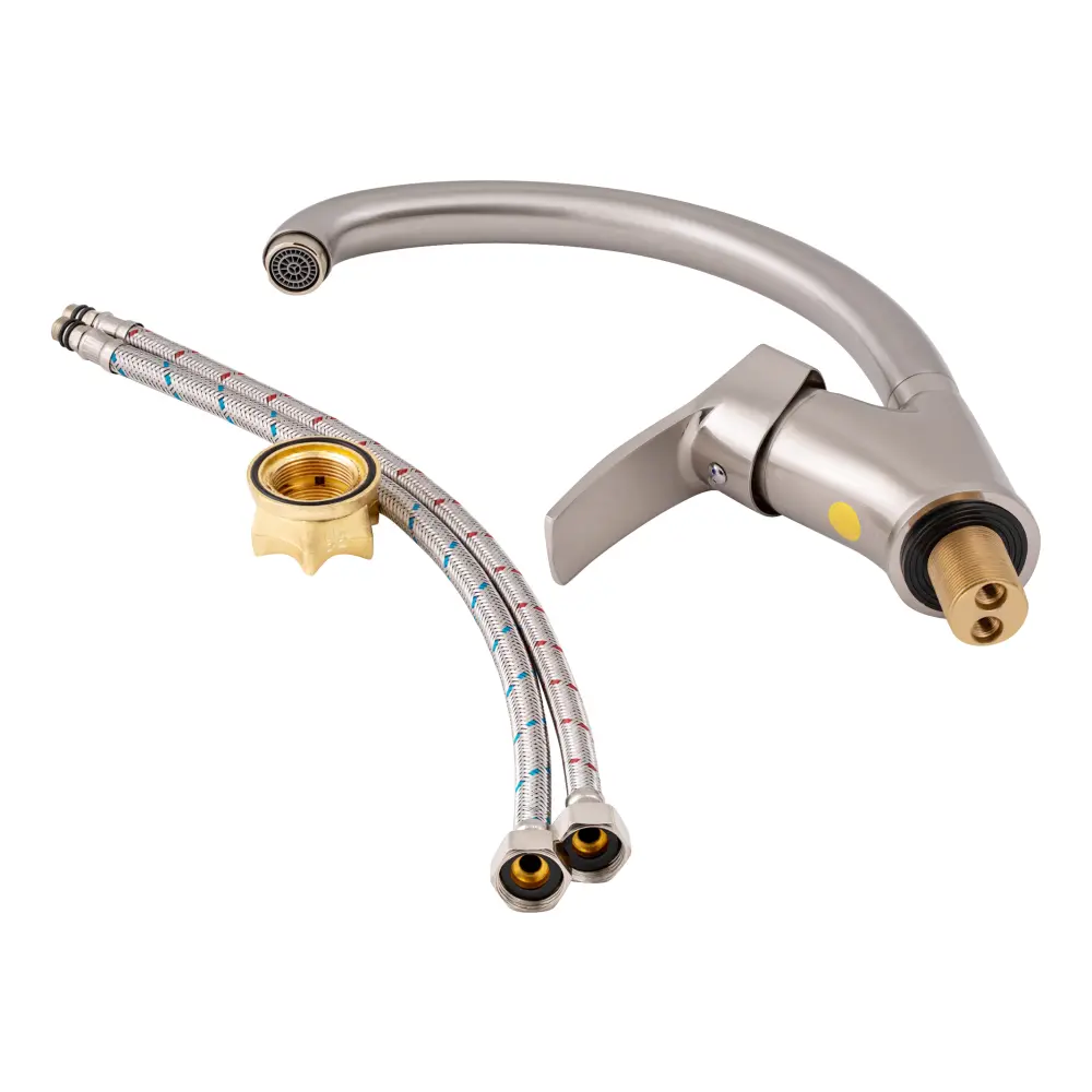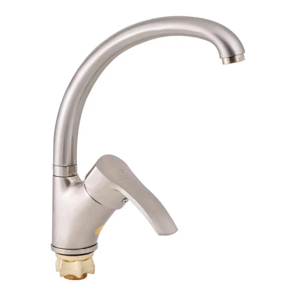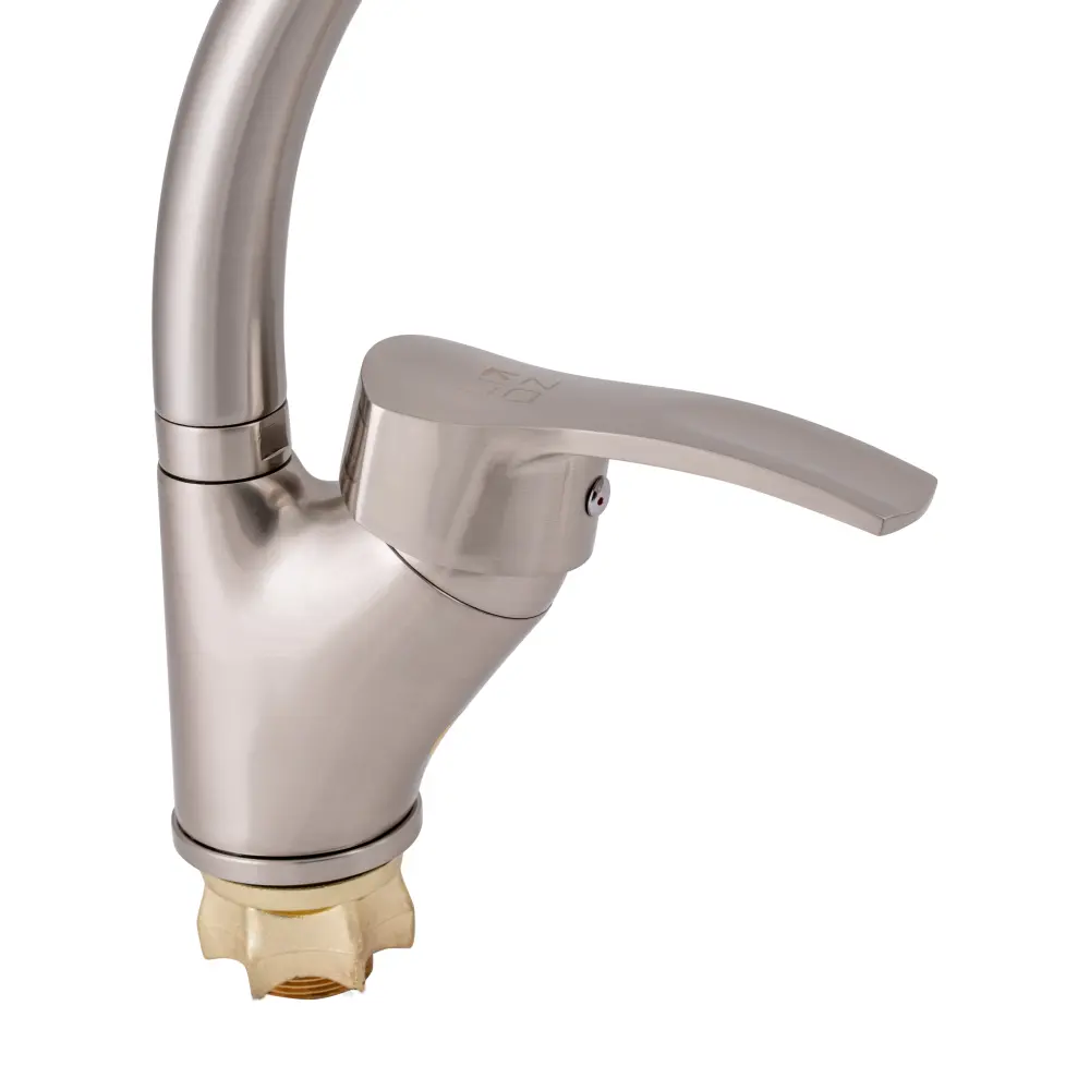 Смеситель для кухни Lidz (NKS) 20 38 011 03 изготовлен из цинка. Имеет брашовану никелированное поверхность, благодаря которой выглядит оригинально. Смеситель выполнен в классическом стиле, с высоким С-изливом и удобной ручкой для переключения холодной и горячей воды.