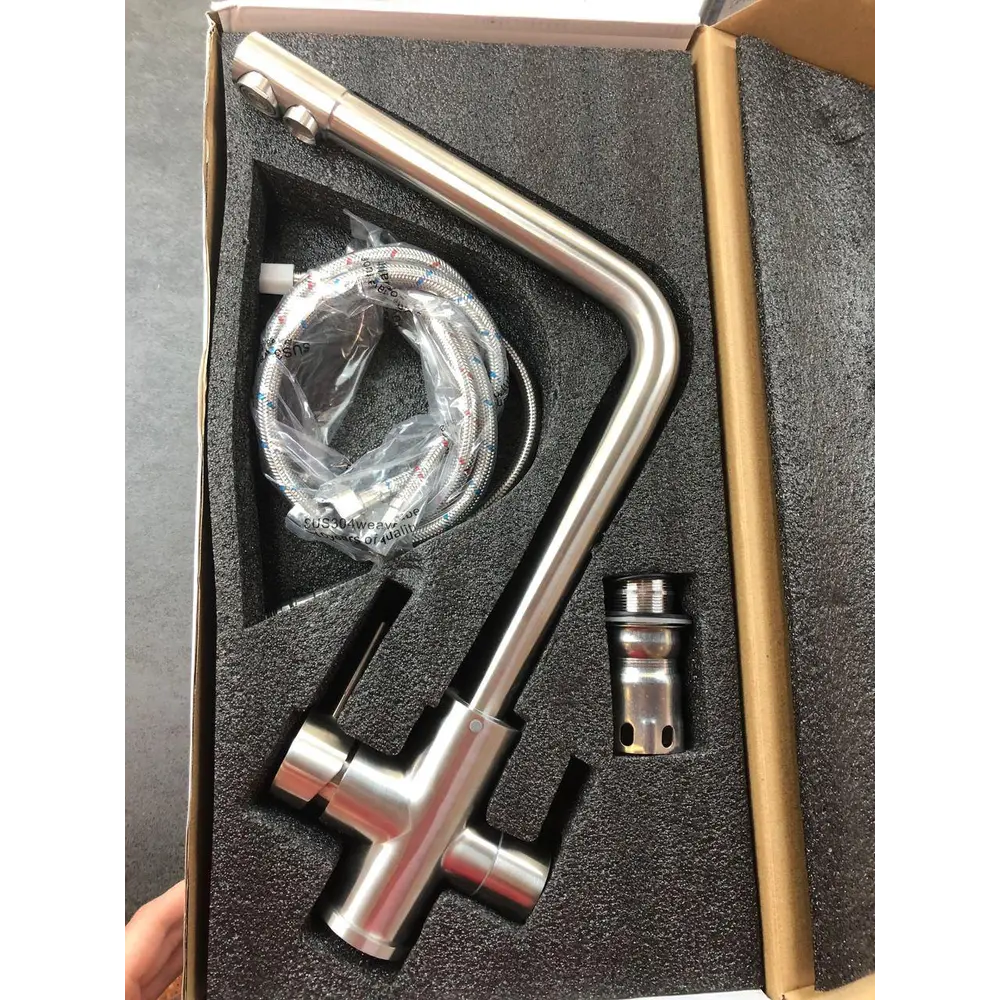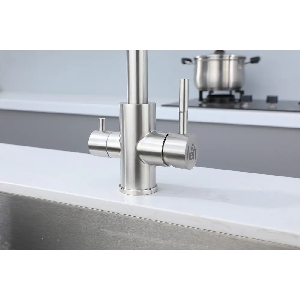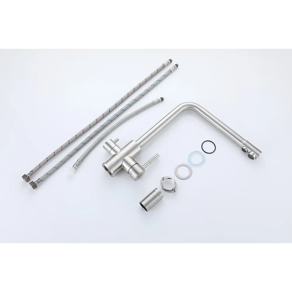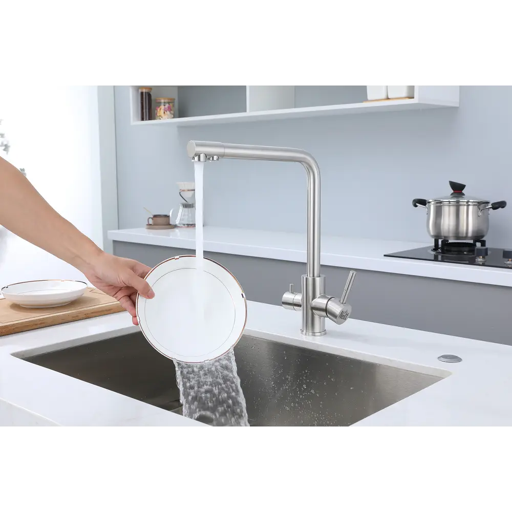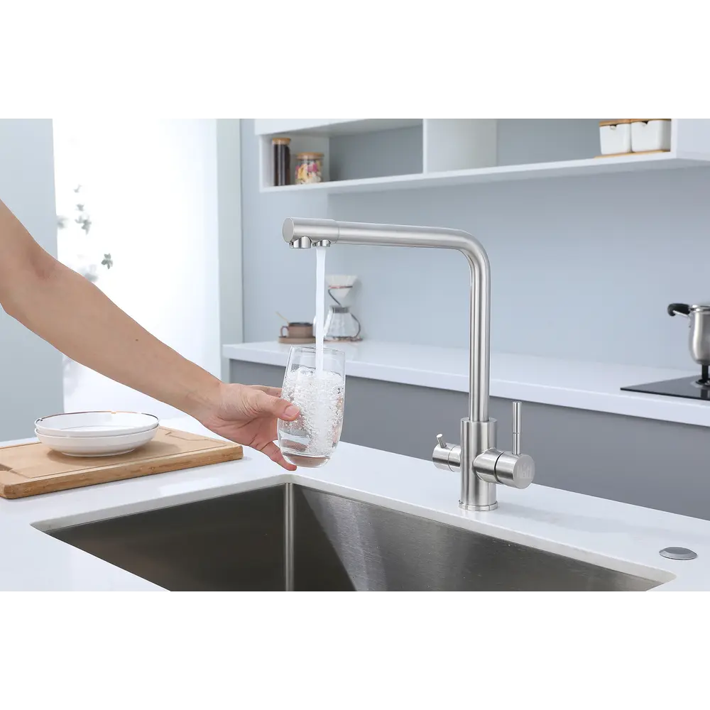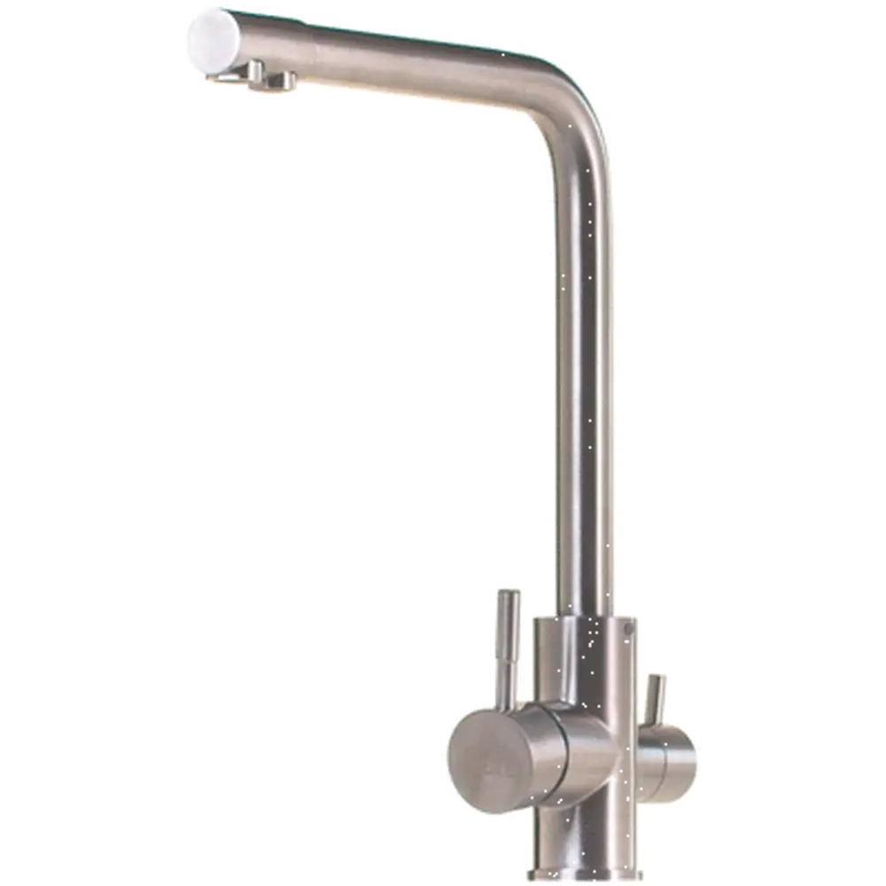 Змішувач обладнаний фільтром і може бути підключений як до водопровідної, так і до фільтрованої води. Управління потоком води здійснюється двома зручними важелями.