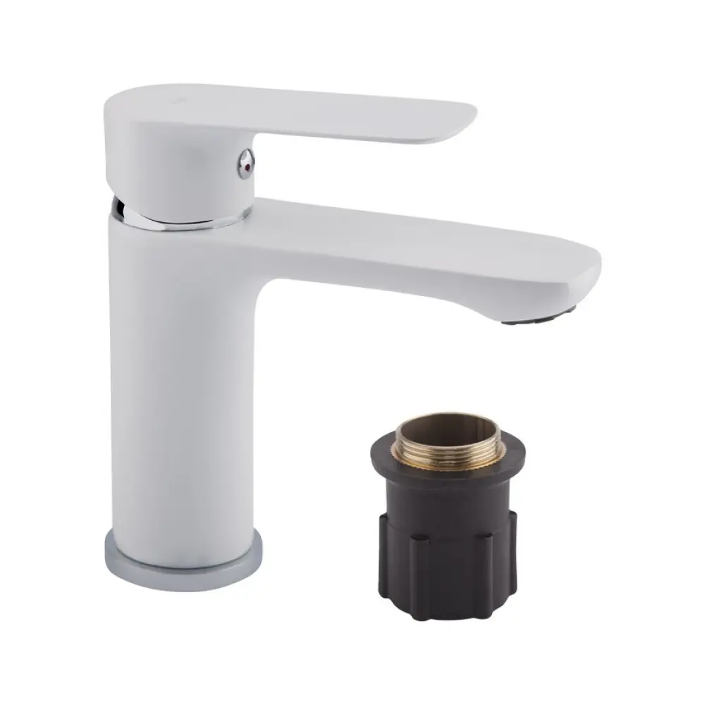 Смеситель для раковины GF (WCR) S-07-001F изготовлен из силумина. Белая матовая поверхность придает смесителю оригинальный внешний вид. Интенсивность водного потока и температура регулируются с помощью перемещения рычага. Подключение воды происходит через гибкие шланги диаметром пидмикання 1/2 ", которые есть в комплекте.