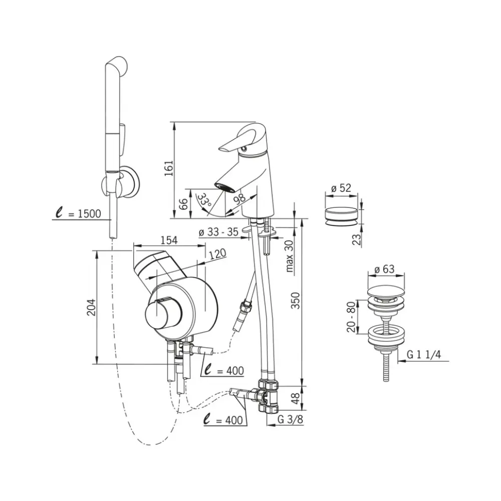 Змішувач, Гнучкий підвід, Лійка для біде, Душовий шланг, Кронштейн, Кнопка, Донний клапан, Кріпильні деталі