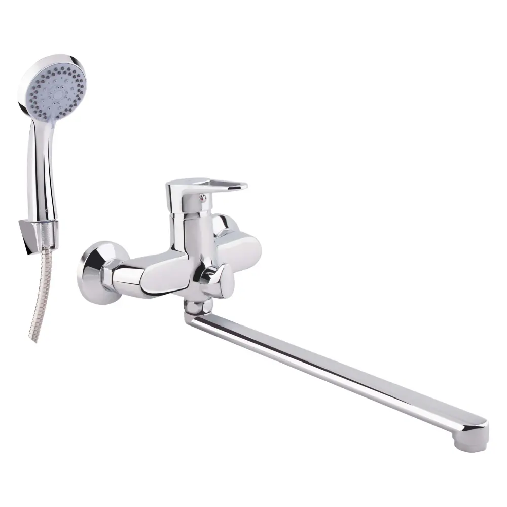Смеситель для ванны GF (CRM) / S-02-005N с длинным поворотным изливом изготовлен из силумина, укомплектован кронштейном для ручного душа, душевым шлангом и лейкой. Для включения потока воды предусмотрено рычаг с нанесенным маркировкой Х + Г воды, для переключения на душ - поворотный дивертор. Настенный монтаж осуществляется с помощью крепежных деталей, которые комплектуются вместе со смесителем. Круглые розетки скроют следы установки на обработке.